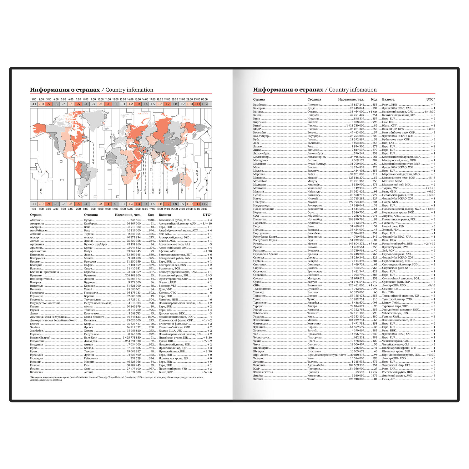 Внутренний блок включает 160 листов белой бумаги плотностью 70 г/м2. Каждая страничка имеет перфорированный угол. Благодаря стандартному формату А5 (145х213 мм) ежедневник удобно использовать как в офисе, так и на выездных деловых встречах. Твердая обложка стилизована под гладкую кожу и имеет стильный магнитный клапан, благодаря чему он не откроется в сумочке или портфеле, и листы не помнутся. Материал обложки подходит для горячего тиснения. Дополнениями являются две закладки-ляссе, с помощью которых при необходимости можно быстро открыть ежедневник на нужной странице. Справочный материал дополнительно расширяет функциональность ежедневника. В конце внутреннего блока есть 7 страниц для записей и заметок.