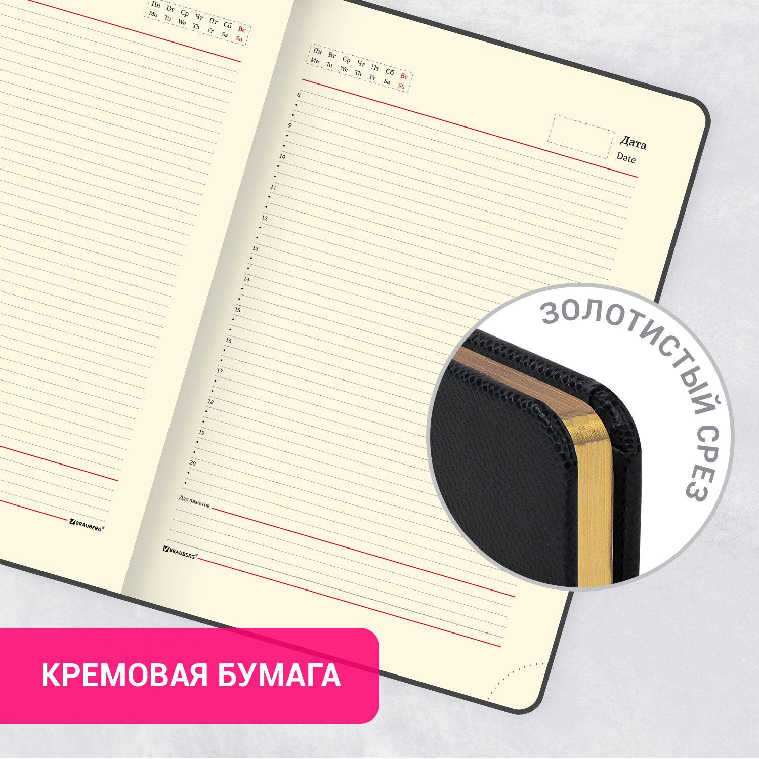 Внутренний блок включает 160 листов тонированной бумаги плотностью 70 г/м2. Каждая страничка имеет перфорированный угол. Благодаря большому формату А4 (210х297 мм) ежедневник удобно использовать как в офисе, так и на выездных деловых встречах. Твердая обложка стилизована под кожу рептилии классического черного цвета. Подходит для горячего тиснения. Срез ежедневника фольгирован золотой фольгой, что придает ему особый шарм. На форзаце располагаются карты России и мира. Дополнением является закладка-ляссе, с помощью которой при необходимости можно быстро открыть ежедневник на нужной странице. Помимо прочего, ежедневник снабжен обширным справочным материалом. В конце ежедневника есть 7 страниц для записей и заметок.Недатированный ежедневник BRAUBERG «Iguana» идеально подойдет для офисных работников и людей, занимающихся бизнесом, ценящих свое драгоценное время.