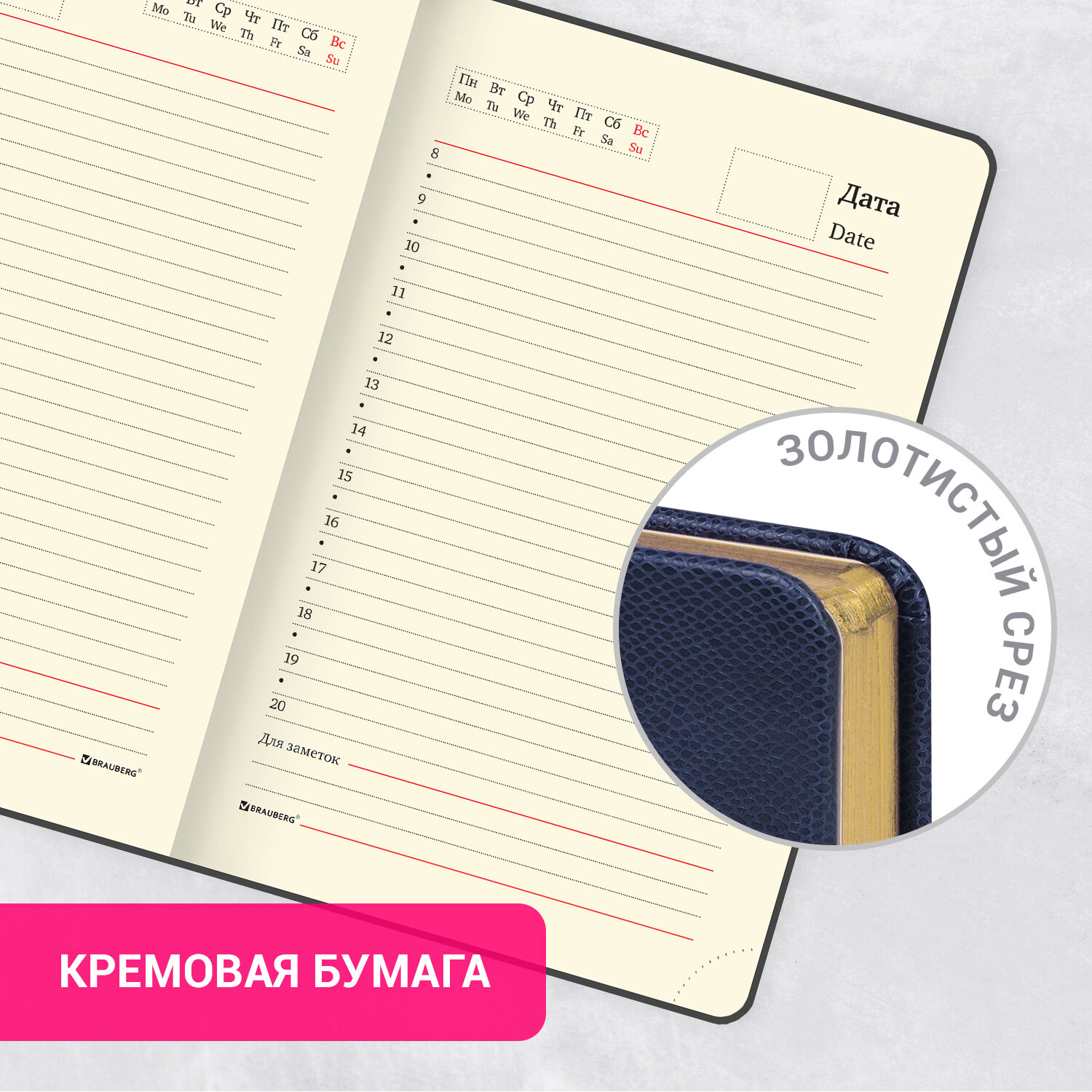 Внутренний блок включает 160 листов тонированной бумаги плотностью 70 г/м2. Каждая страничка имеет перфорированный угол. Благодаря формату А6 (100х150 мм) ежедневник удобно использовать как в офисе, так и на выездных деловых встречах.Твердая обложка, стилизованная под кожу рептилии, подходит для горячего тиснения. Срез ежедневника фольгирован под «золото», что придает ему особый шарм. Дополнением является закладка-ляссе, с помощью которой при необходимости можно быстро открыть ежедневник на нужной странице. Помимо прочего ежедневник снабжен обширным справочным материалом. В конце ежедневника есть 5 страниц для записей и заметок.Недатированный ежедневник BRAUBERG «Iguana» — отличный подарок к любому празднику или событию.