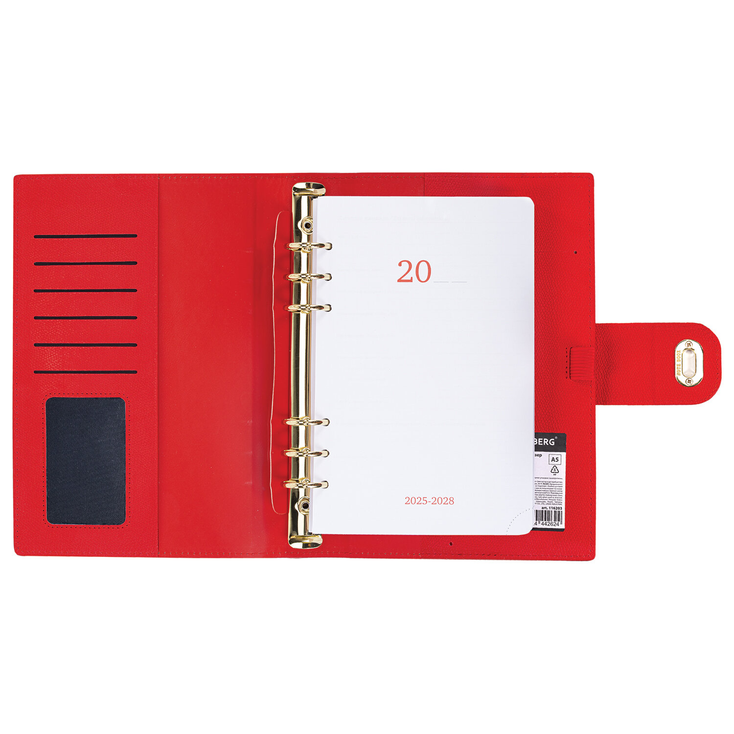 Твердая обложка с кольцевым механизмом оснащена дополнительными карманами для хранения бумаг, карточек и мелочей. Съемный внутренний блок включает 160 листов белой бумаги плотностью 70 г/м2. Благодаря формату B5 (167х240мм) ежедневник удобно использовать как в офисе, так и на выездных деловых встречах. Ежедневник снабжен стильной застежкой с поворотным механизмом, благодаря чему он не откроется в сумочке или портфеле, и листы не помнутся. Дополнением является держатель для ручки, что позволяет держать при себе все самое необходимое. Ежедневник содержит обширный справочный материал, а также 7 страниц для записей и заметок. Уголки – закругленные.