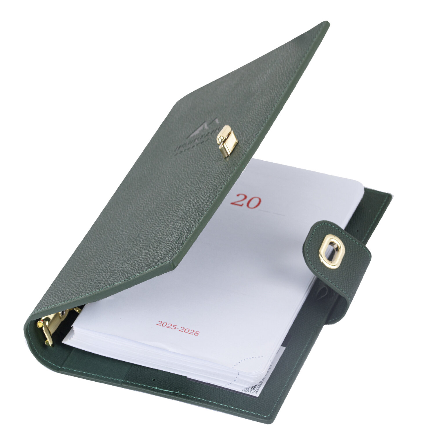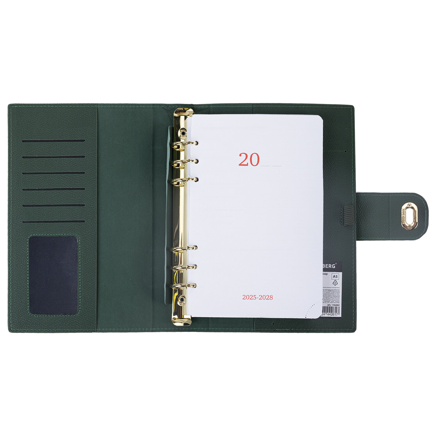 Твердая обложка с кольцевым механизмом оснащена дополнительными карманами для хранения бумаг, карточек и мелочей. Съемный внутренний блок включает 160 листов белой бумаги плотностью 70 г/м2. Благодаря формату B5 (167х240 мм) ежедневник удобно использовать как в офисе, так и на выездных деловых встречах. Ежедневник снабжен стильной застежкой с поворотным механизмом, благодаря чему он не откроется в сумочке или портфеле, и листы не помнутся. Дополнением является держатель для ручки, что позволяет держать при себе все самое необходимое. Ежедневник содержит обширный справочный материал, а также 7 страниц для записей и заметок. Уголки – закругленные.