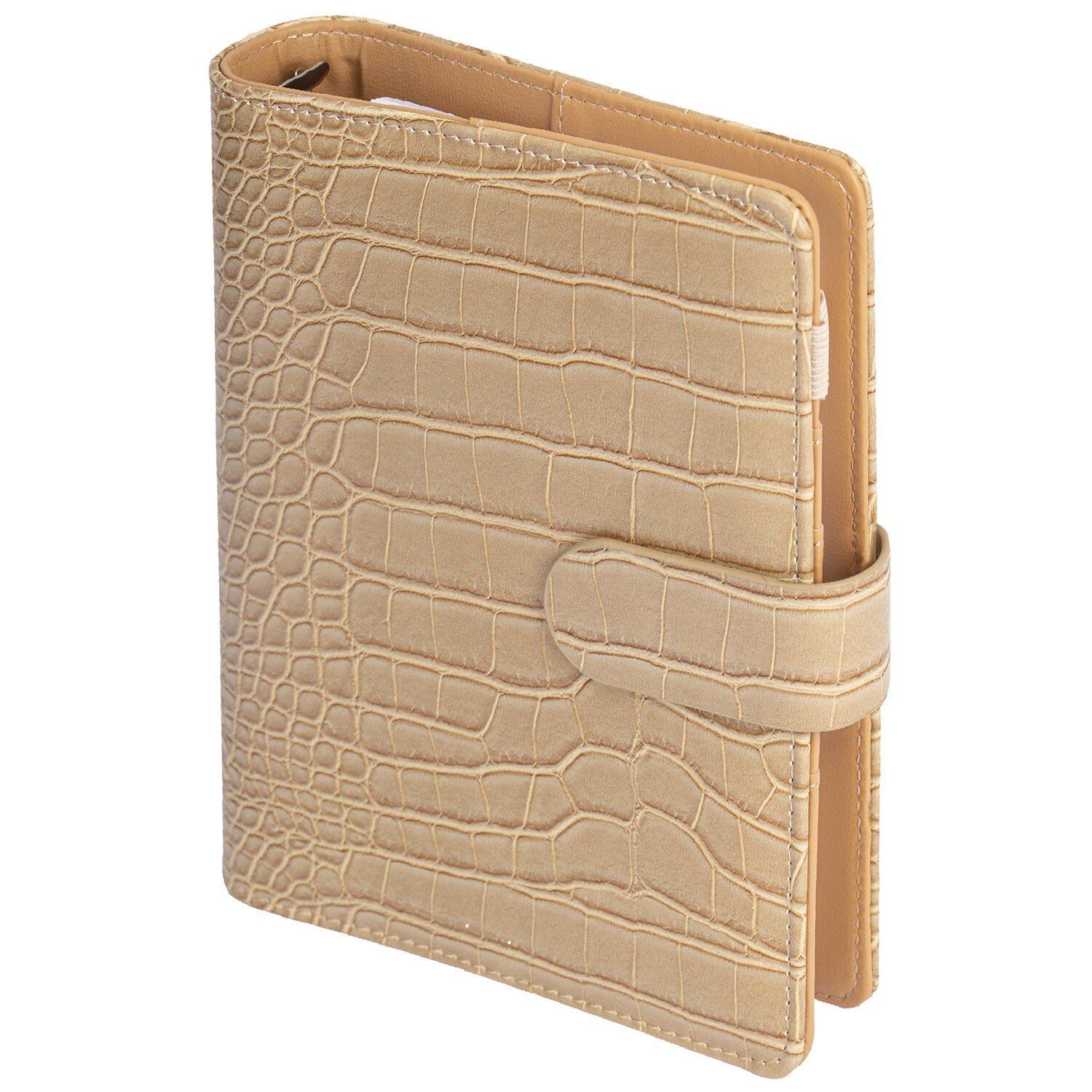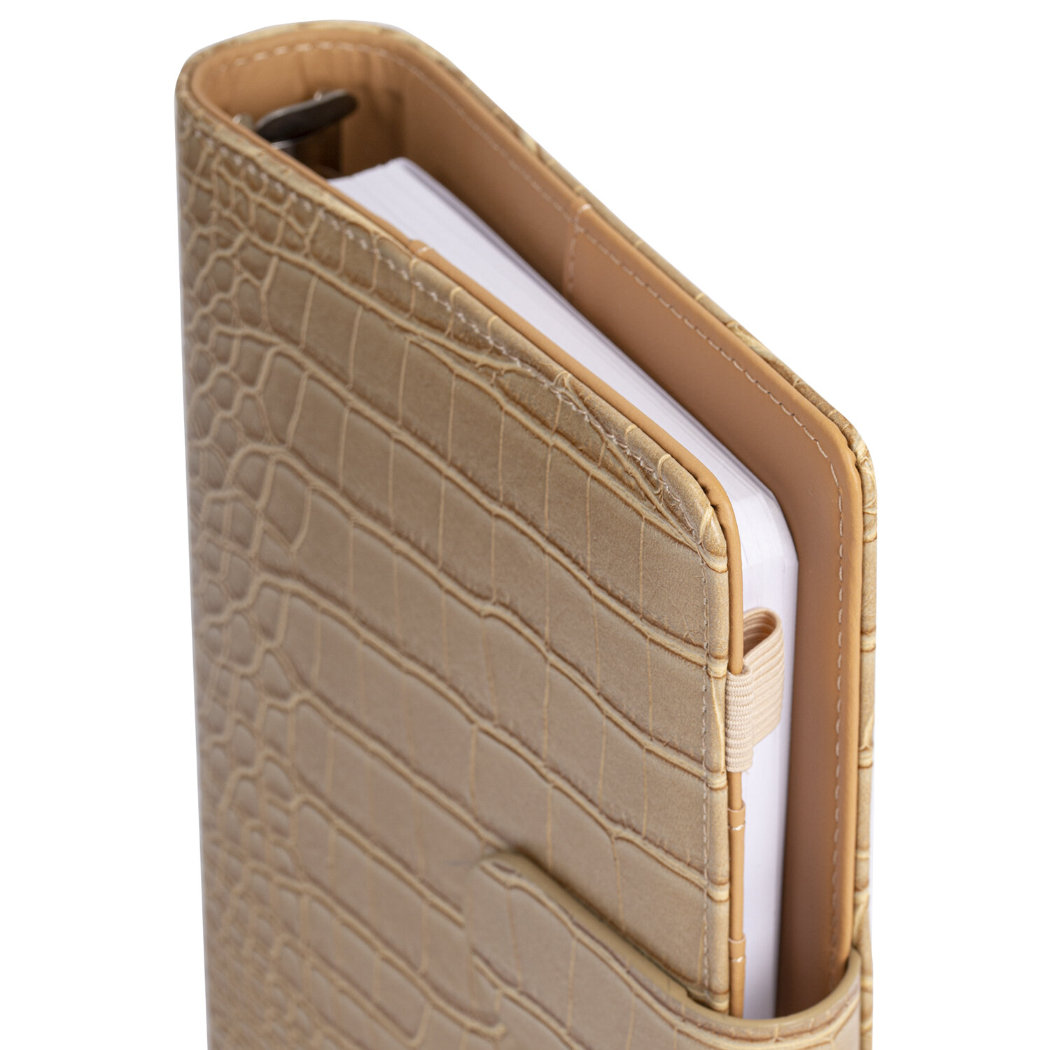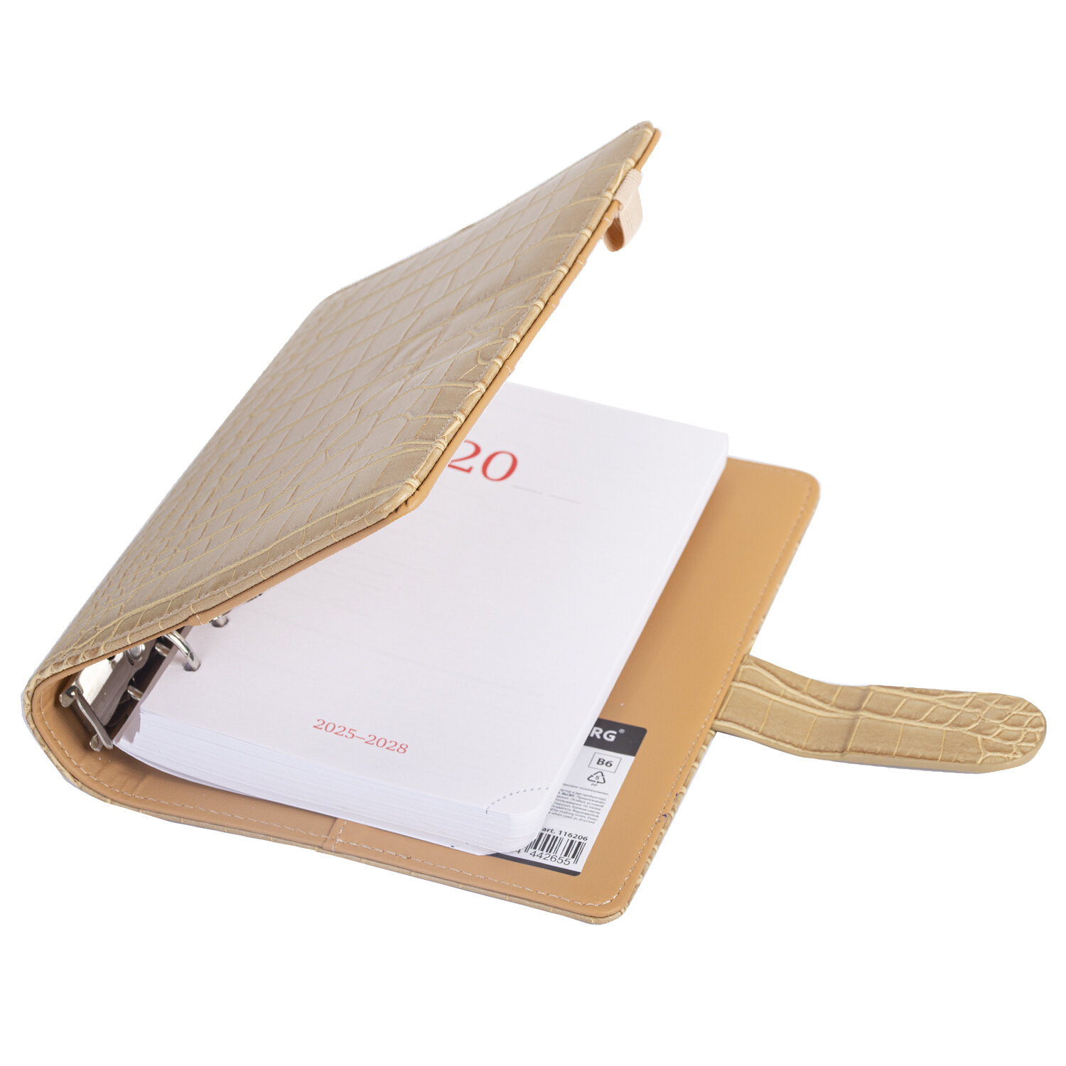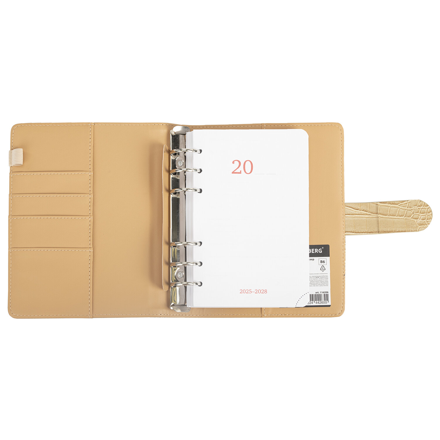 Твердая обложка с кольцевым механизмом оснащена дополнительными карманами для хранения бумаг, карточек и мелочей. Съемный внутренний блок включает 160 листов белой бумаги плотностью 70 г/м2. Благодаря формату B6+ (150×190мм) ежедневник удобно использовать как в офисе, так и на выездных деловых встречах. Ежедневник снабжен стильной магнитной застежкой, благодаря чему он не откроется в сумочке или портфеле, и листы не помнутся. Дополнением является держатель для ручки, что позволяет держать при себе все самое необходимое. Ежедневник содержит обширный справочный материал, а также 7 страниц для записей и заметок. Уголки – закругленные.