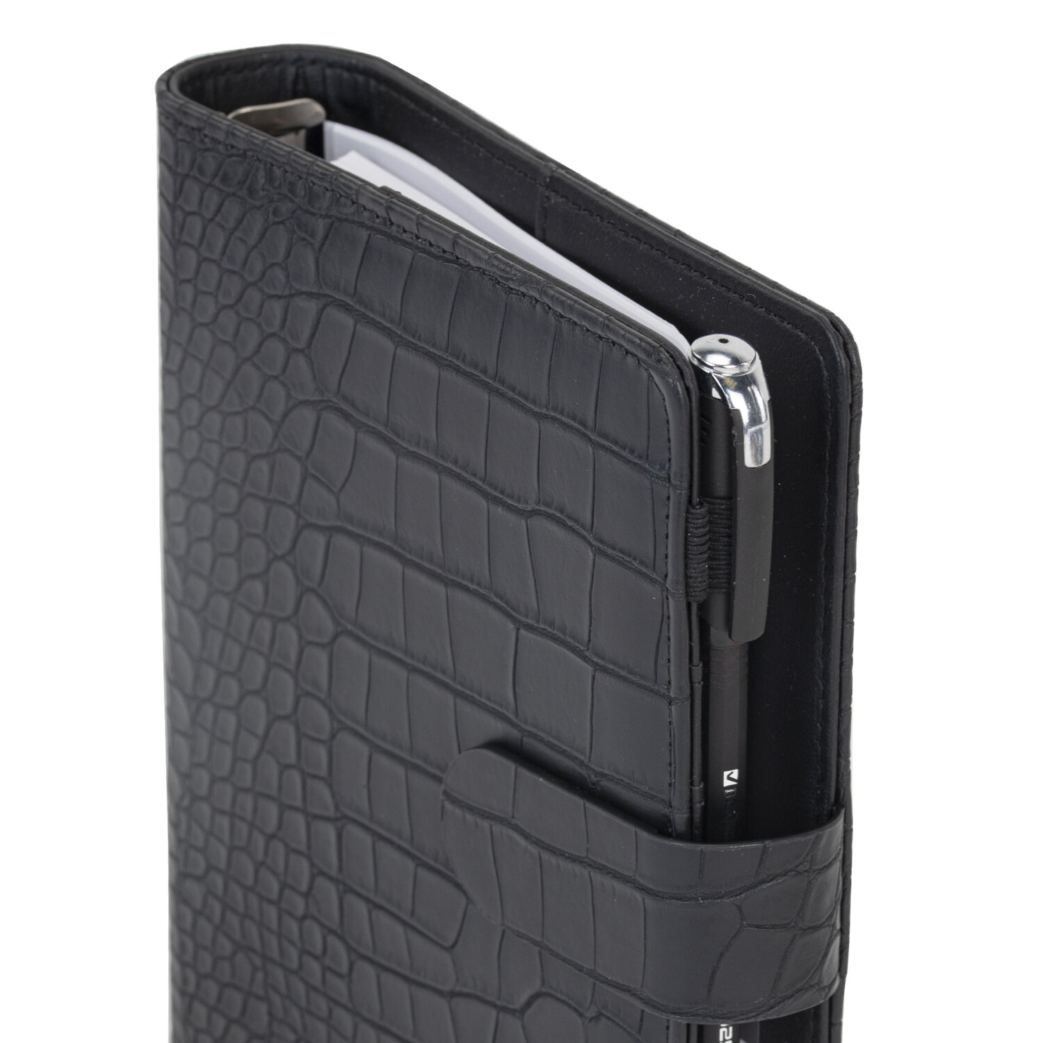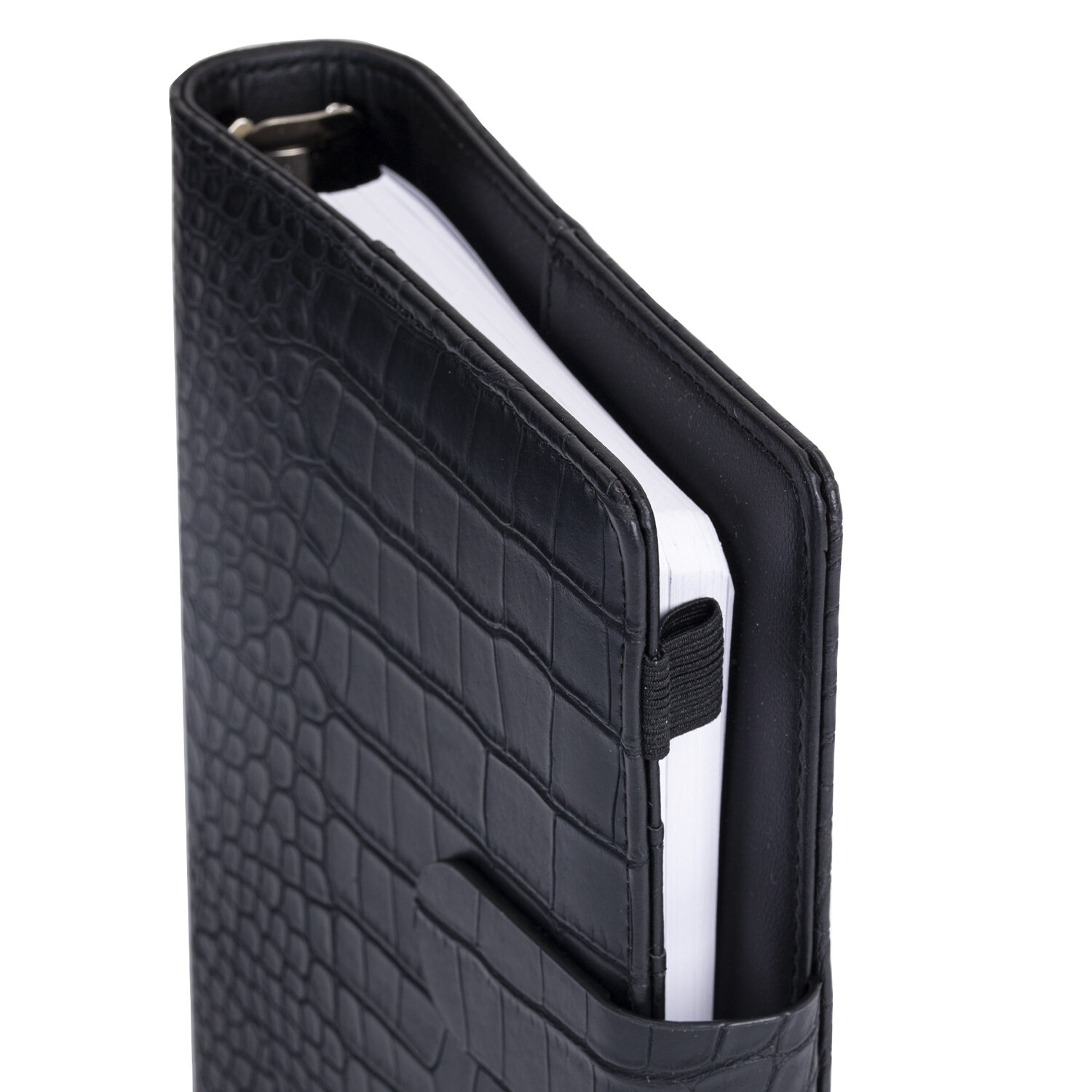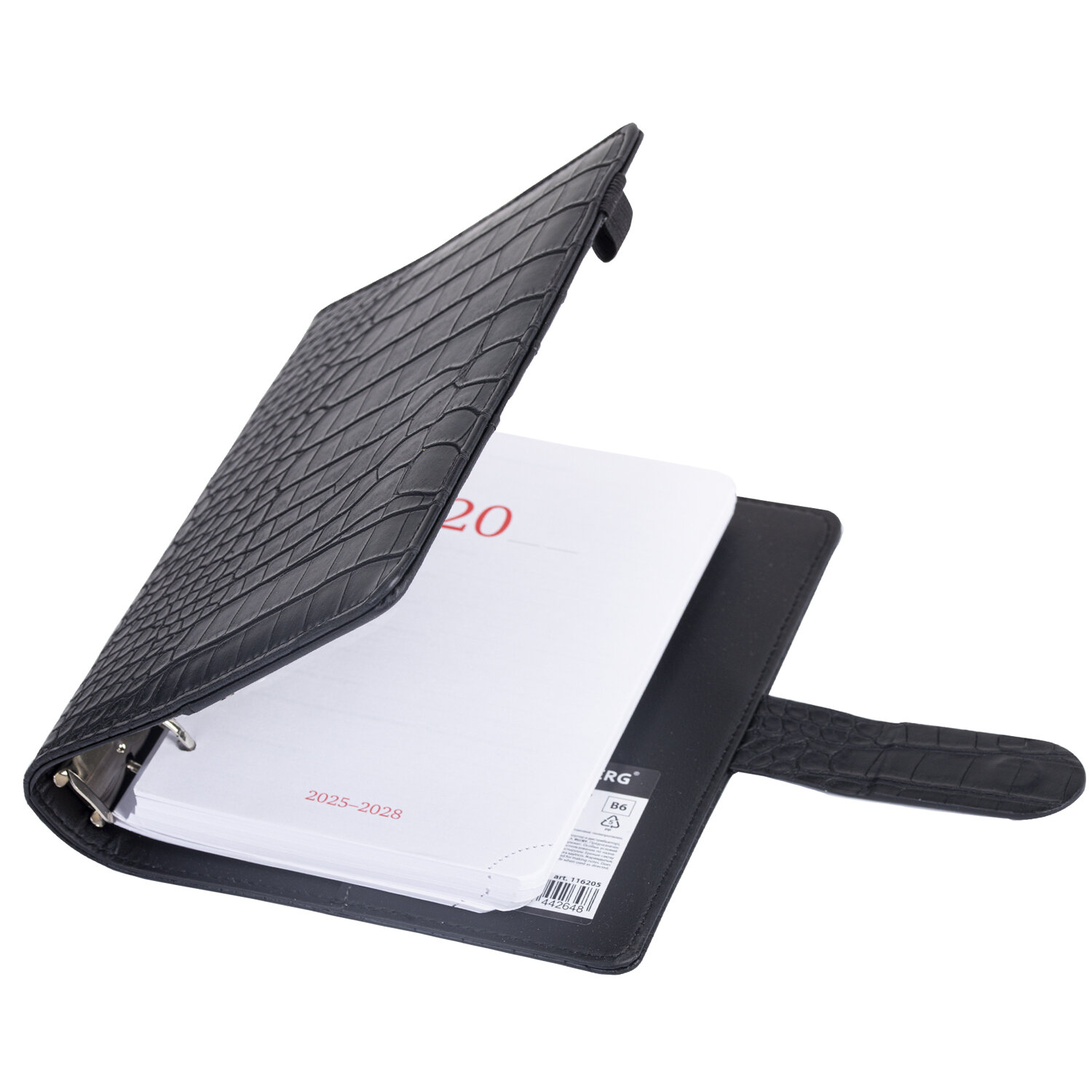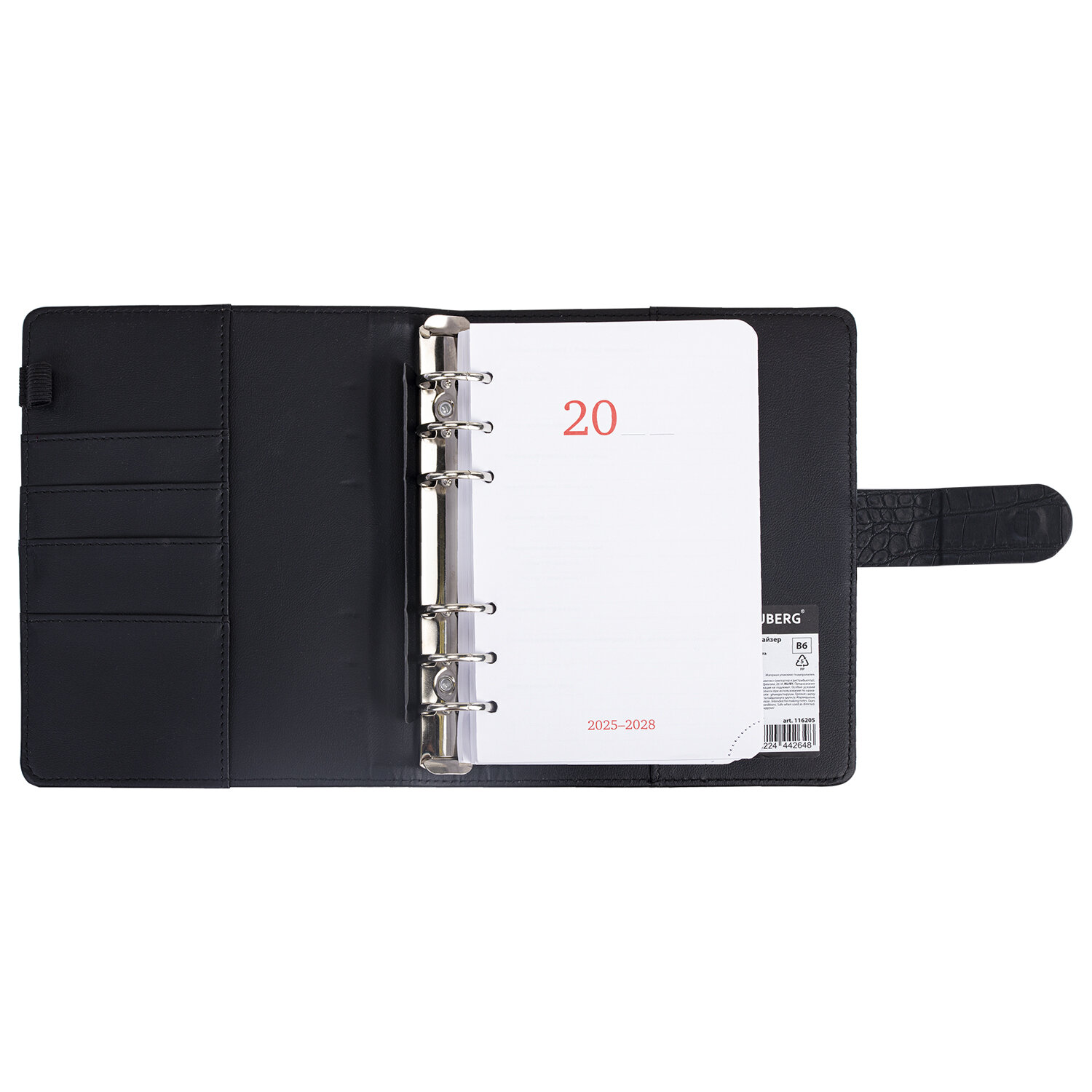 Твердая обложка с кольцевым механизмом оснащена дополнительными карманами для хранения бумаг, карточек и мелочей. Съемный внутренний блок включает 160 листов белой бумаги плотностью 70 г/м2. Благодаря формату B6+ (150×190 мм) ежедневник удобно использовать как в офисе, так и на выездных деловых встречах. Ежедневник снабжен стильной магнитной застежкой, благодаря чему он не откроется в сумочке или портфеле, и листы не помнутся. Дополнением является держатель для ручки, что позволяет держать при себе все самое необходимое. Ежедневник содержит обширный справочный материал, а также 7 страниц для записей и заметок. Уголки – закругленные.