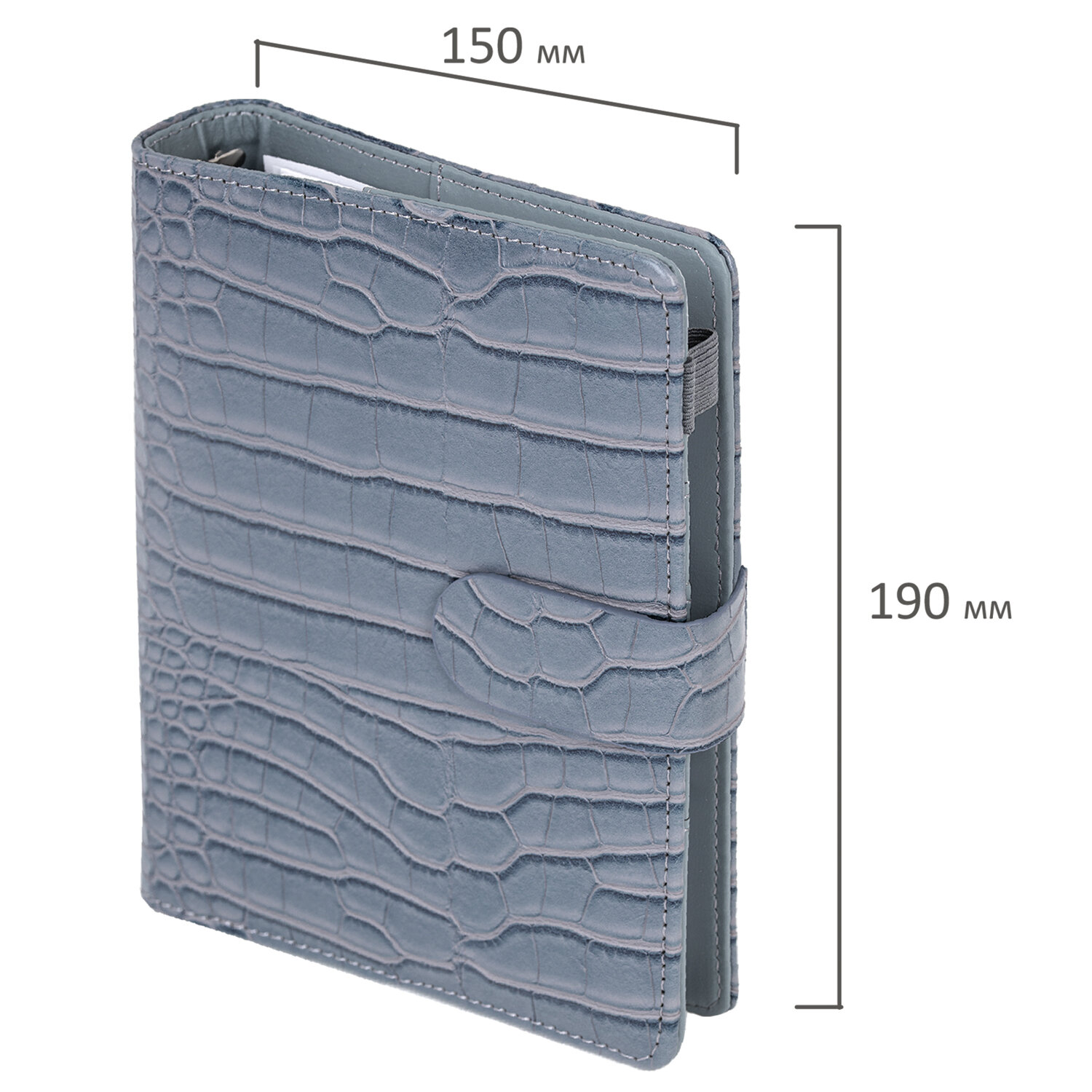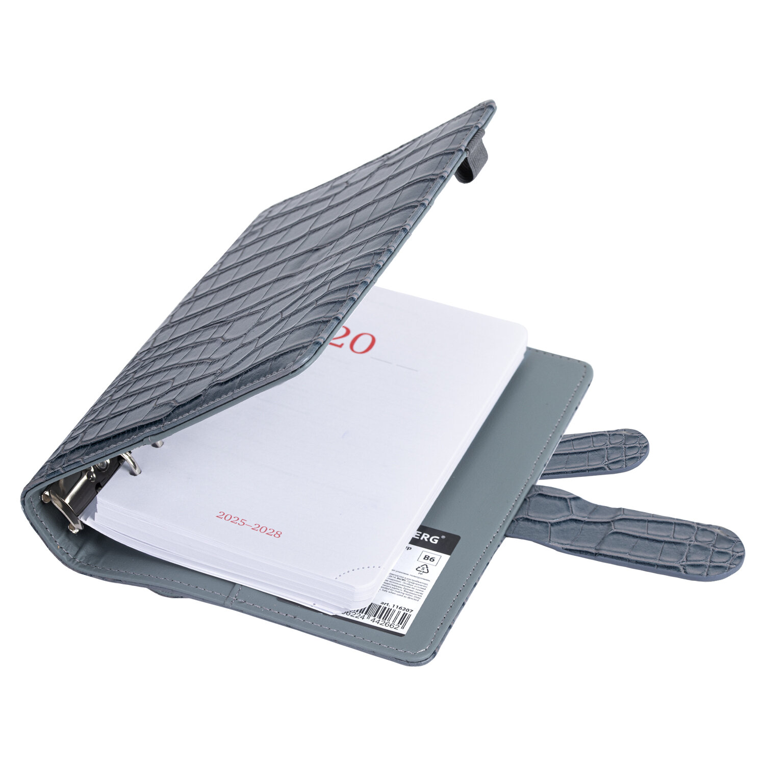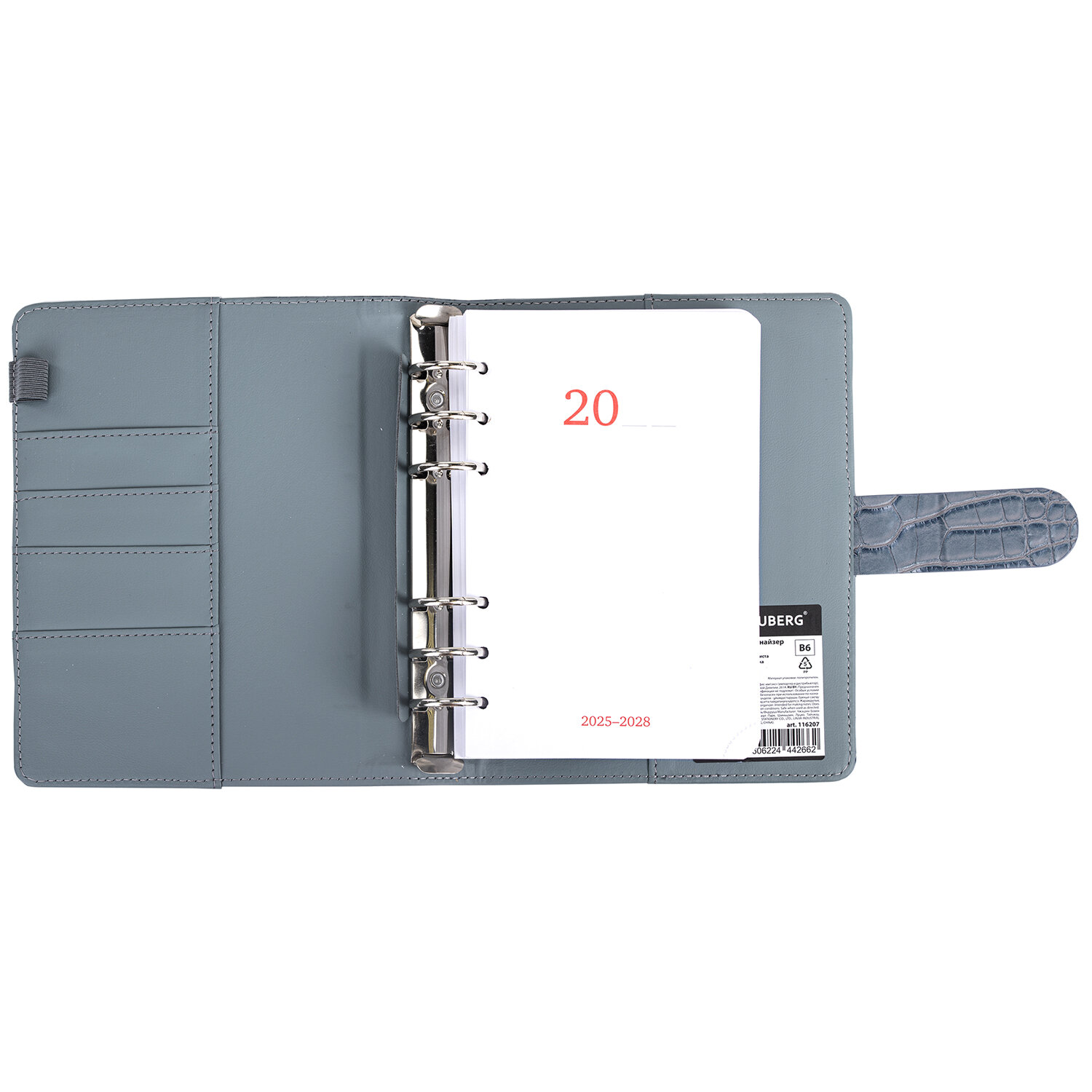 Твердая обложка с кольцевым механизмом оснащена дополнительными карманами для хранения бумаг, карточек и мелочей. Съемный внутренний блок включает 160 листов белой бумаги плотностью 70 г/м2. Благодаря формату B6+ (150×190 мм) ежедневник удобно использовать как в офисе, так и на выездных деловых встречах. Ежедневник снабжен стильной магнитной застежкой, благодаря чему он не откроется в сумочке или портфеле, и листы не помнутся. Дополнением является держатель для ручки, что позволяет держать при себе все самое необходимое. Ежедневник содержит обширный справочный материал, а также 7 страниц для записей и заметок. Уголки – закругленные.