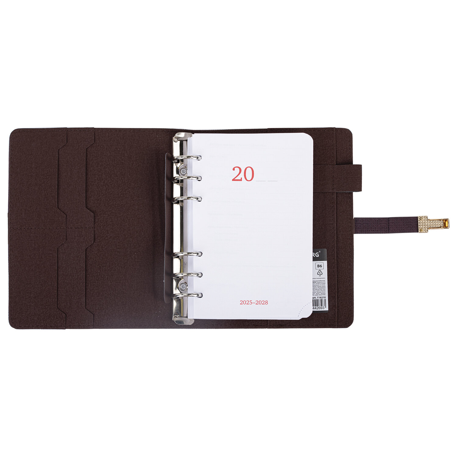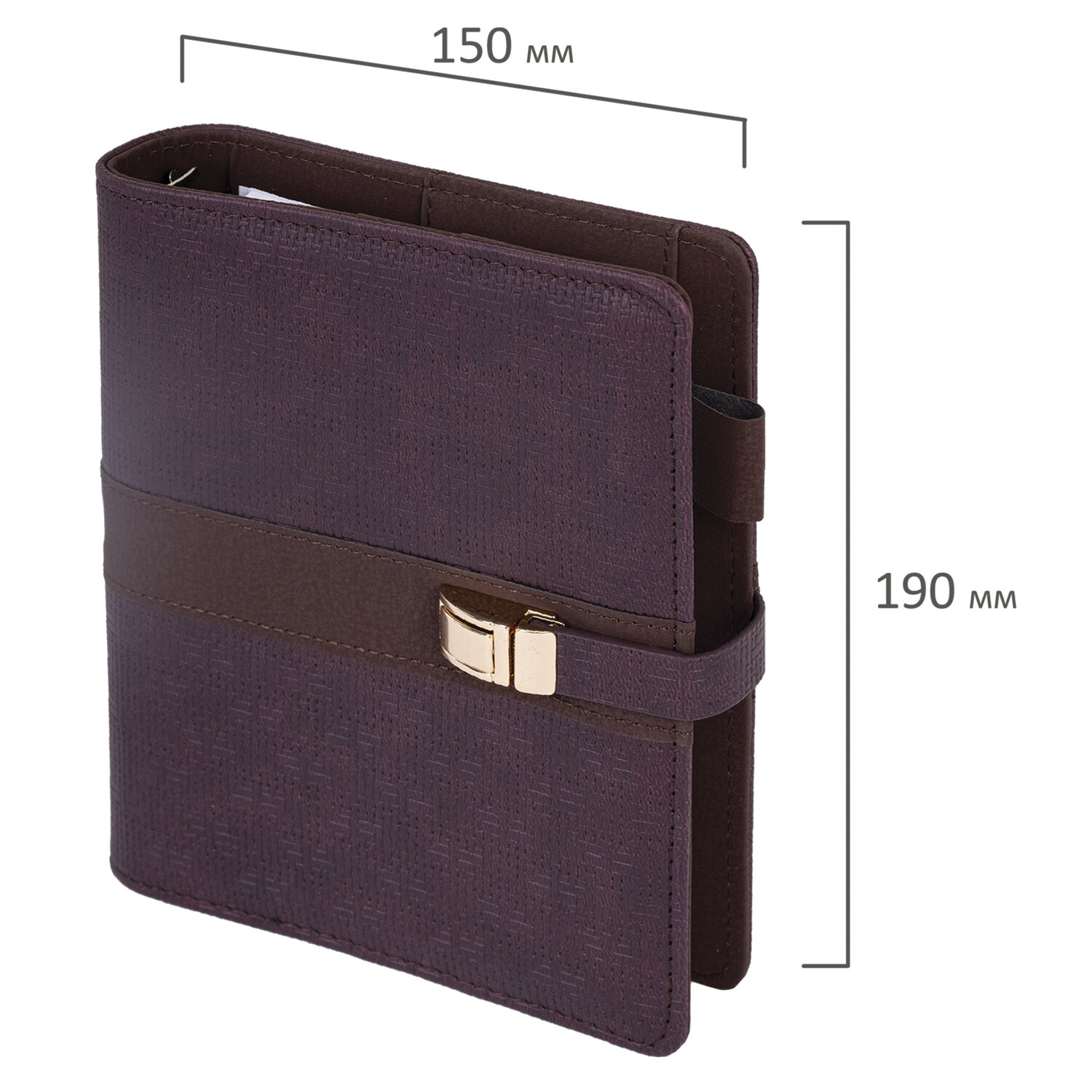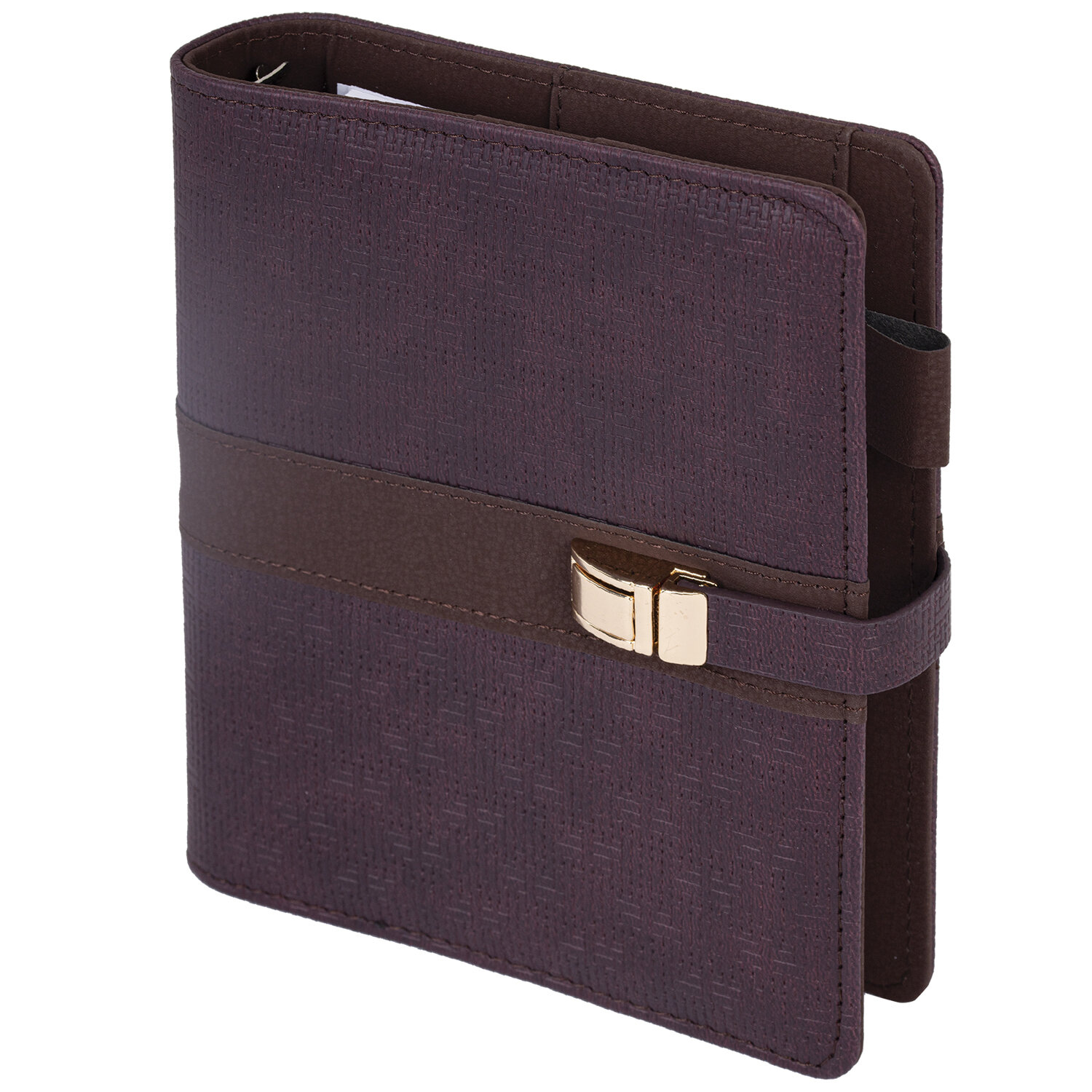 Твердая обложка с кольцевым механизмом оснащена дополнительными карманами для хранения бумаг, карточек и мелочей. Съемный внутренний блок включает 160 листов белой бумаги плотностью 70 г/м2. Благодаря формату B6+ (150×190мм) ежедневник удобно использовать как в офисе, так и на выездных деловых встречах. Ежедневник снабжен стильной золотистой застежкой, благодаря чему он не откроется в сумочке или портфеле, и листы не помнутся. Дополнением является держатель для ручки, что позволяет держать при себе все самое необходимое. Ежедневник содержит обширный справочный материал, а также 7 страниц для записей и заметок. Уголки – закругленные.