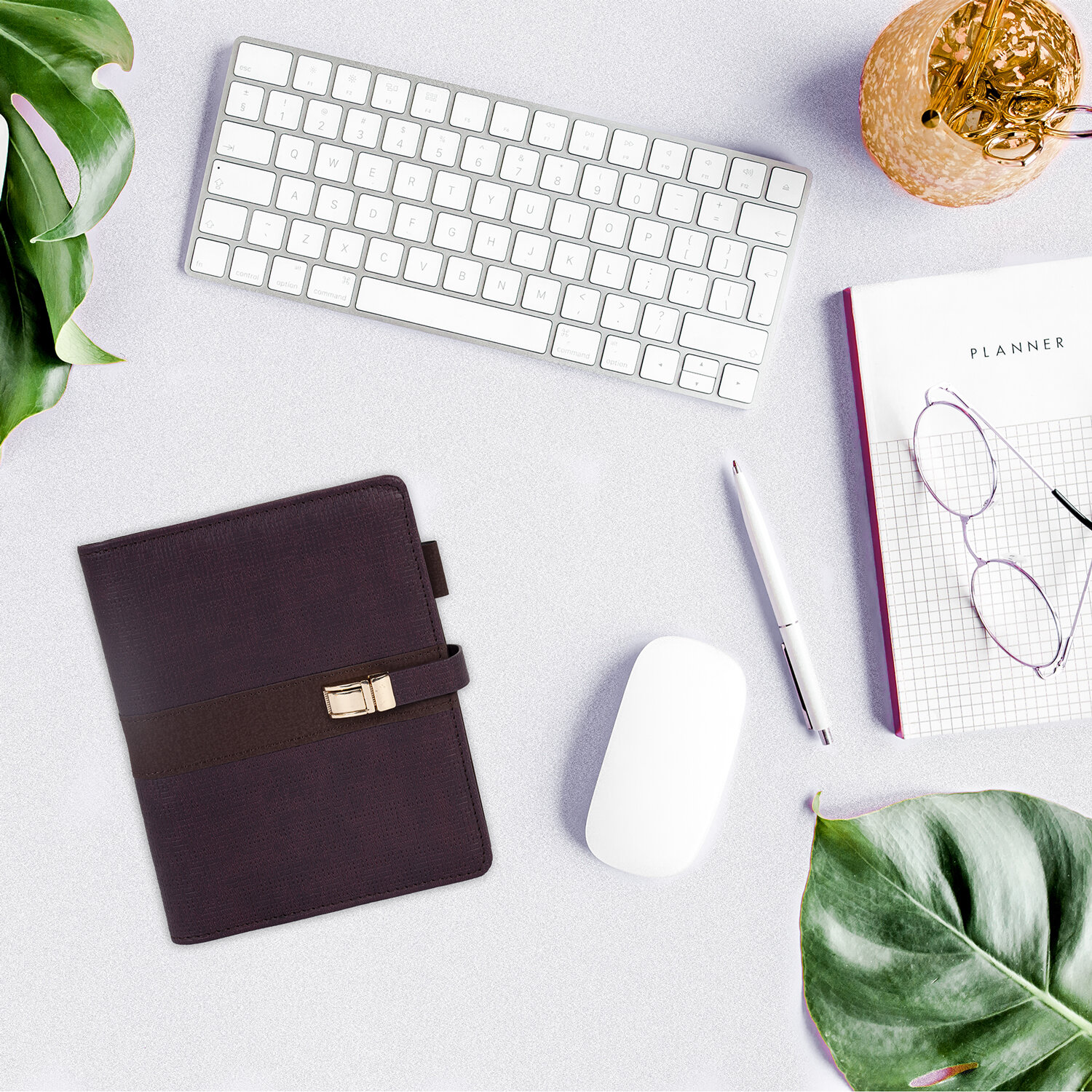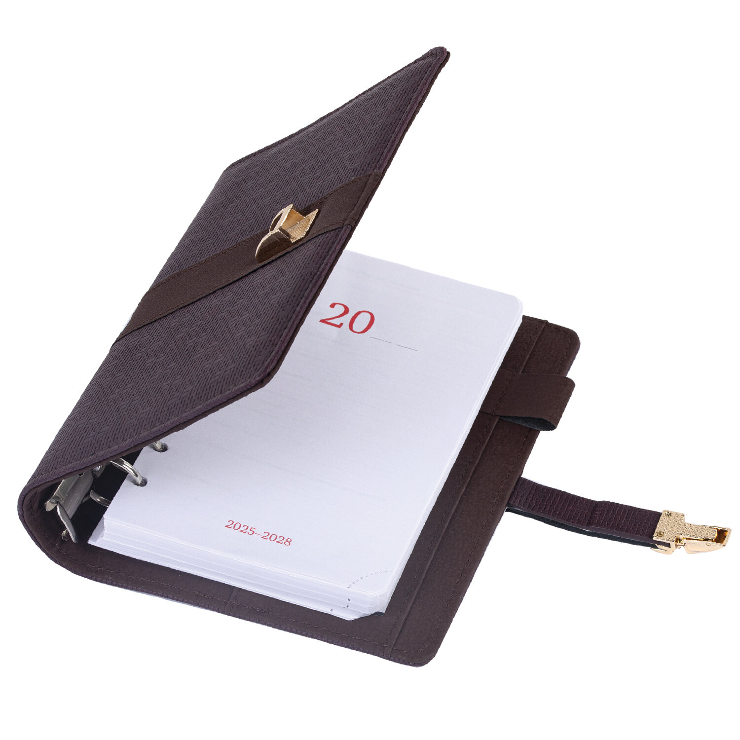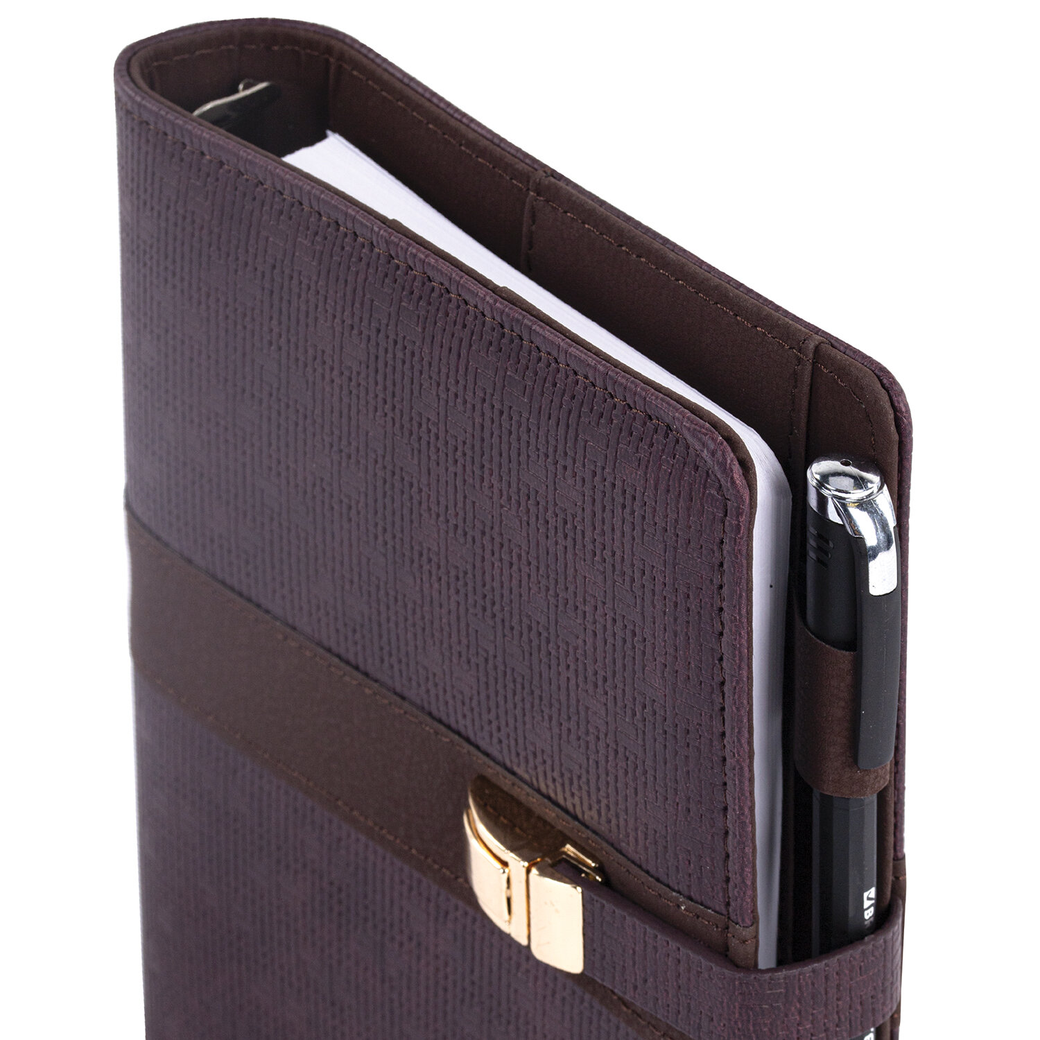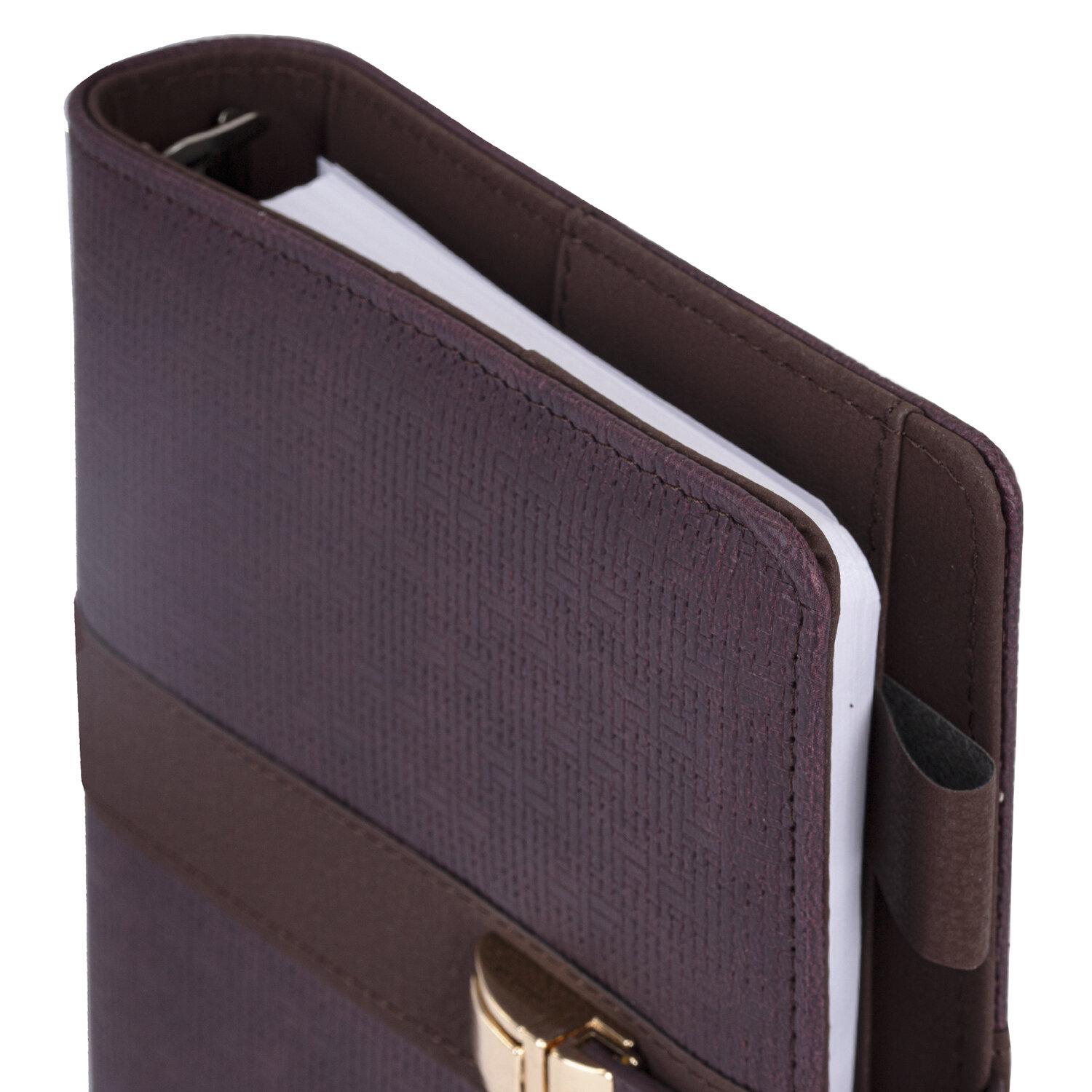 Твердая обложка с кольцевым механизмом оснащена дополнительными карманами для хранения бумаг, карточек и мелочей. Съемный внутренний блок включает 160 листов белой бумаги плотностью 70 г/м2. Благодаря формату B6+ (150×190мм) ежедневник удобно использовать как в офисе, так и на выездных деловых встречах. Ежедневник снабжен стильной золотистой застежкой, благодаря чему он не откроется в сумочке или портфеле, и листы не помнутся. Дополнением является держатель для ручки, что позволяет держать при себе все самое необходимое. Ежедневник содержит обширный справочный материал, а также 7 страниц для записей и заметок. Уголки – закругленные.
