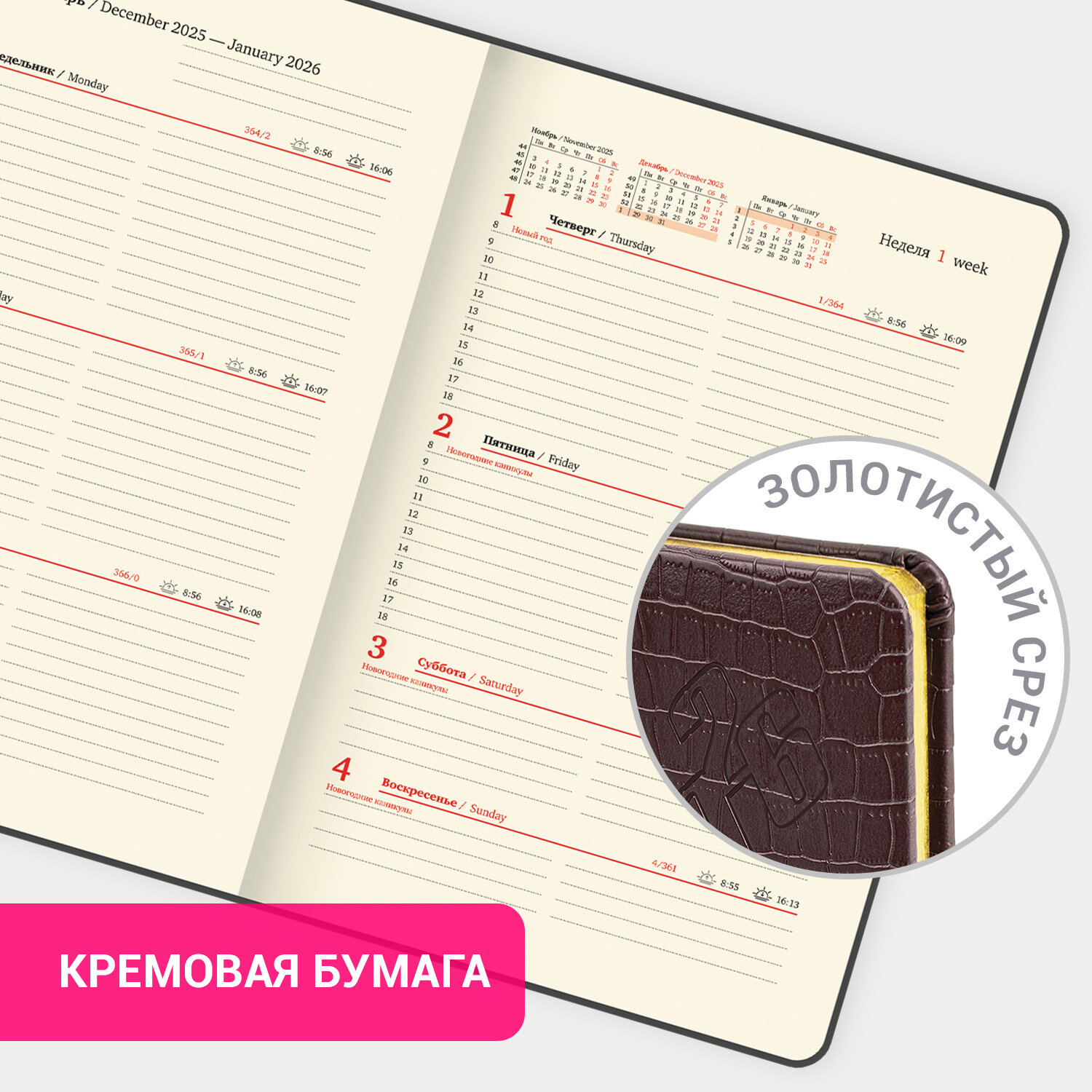 Внутренний блок включает 64 листа тонированной бумаги плотностью 70 г/м2. Благодаря стандартному формату А5 (145х215 мм) еженедельник удобно использовать как в офисе, так и на выездных деловых встречах. Твердая обложка темно-коричневого цвета, стилизованная под кожу крокодила, подходит для горячего тиснения. Срез еженедельника покрыт золотой фольгой, что придает ему особый шарм. Дополнением является закладка-ляссе, с помощью которой при необходимости можно быстро открыть еженедельник на нужной странице. Для заметок в еженедельнике есть 7 страниц в конце внутреннего блока. Помимо прочего, еженедельник снабжен обширным справочным материалом.Датированный еженедельник BRAUBERG «Comodo» идеально подойдет для офисных работников и людей, занимающихся бизнесом и ценящих свое драгоценное время.