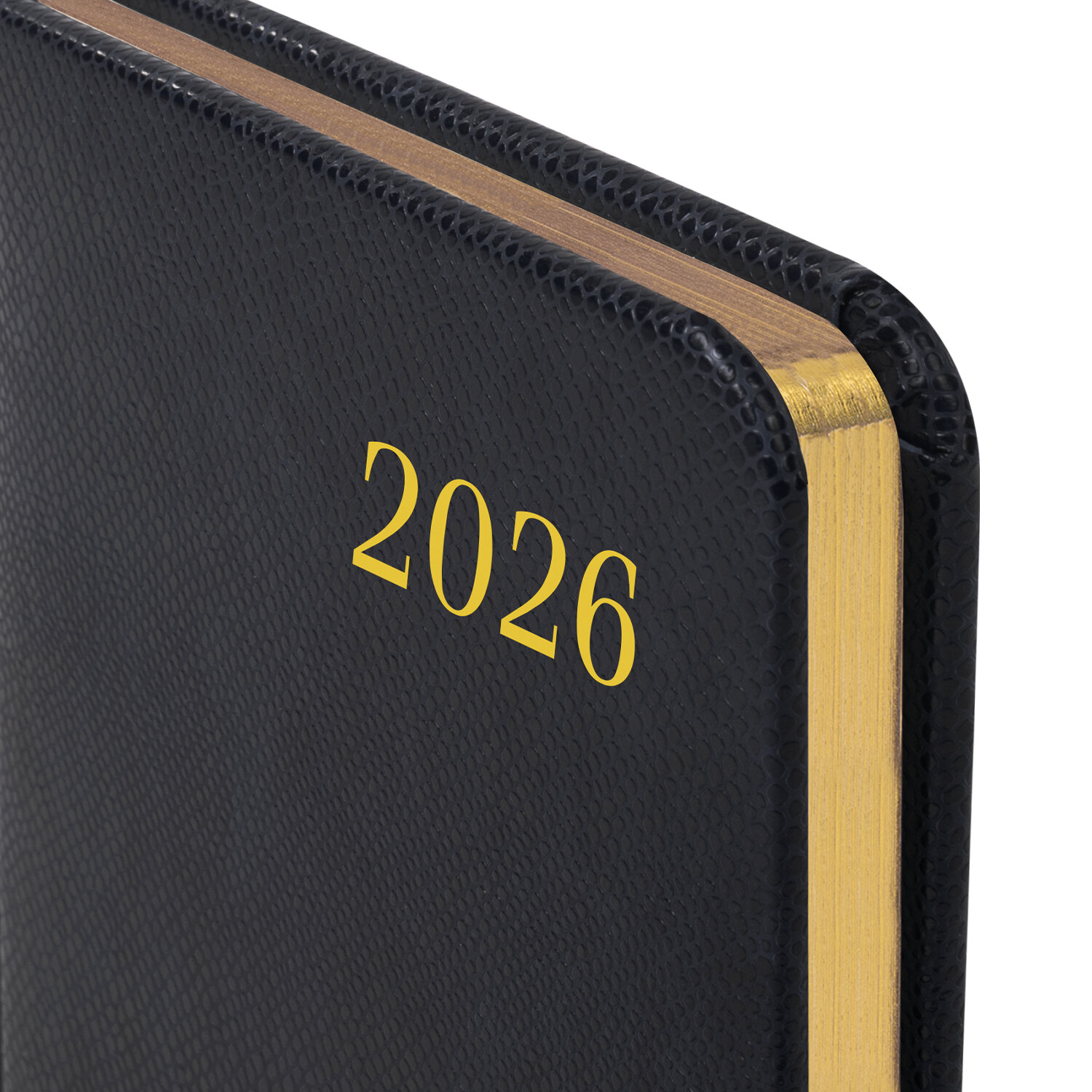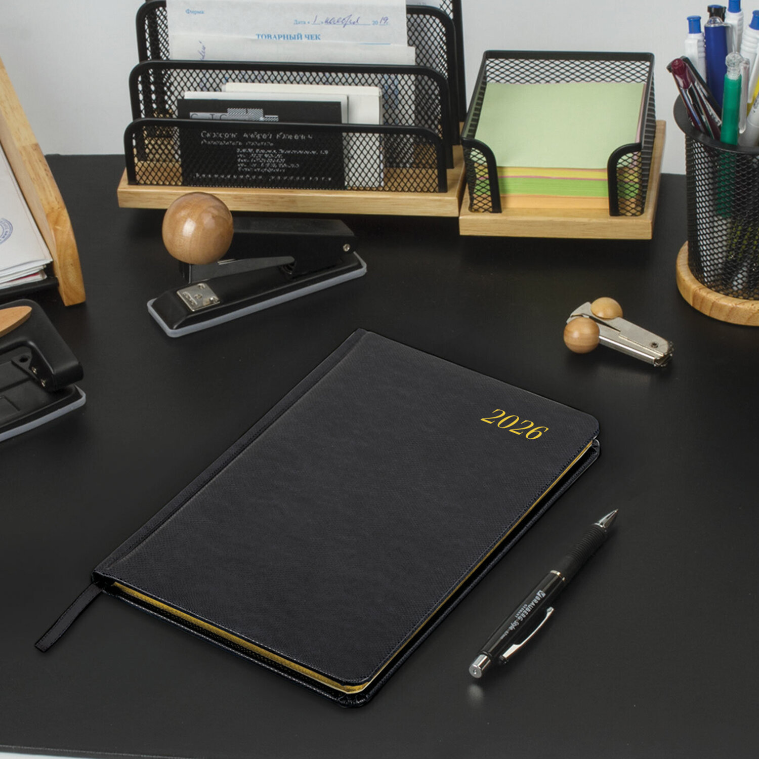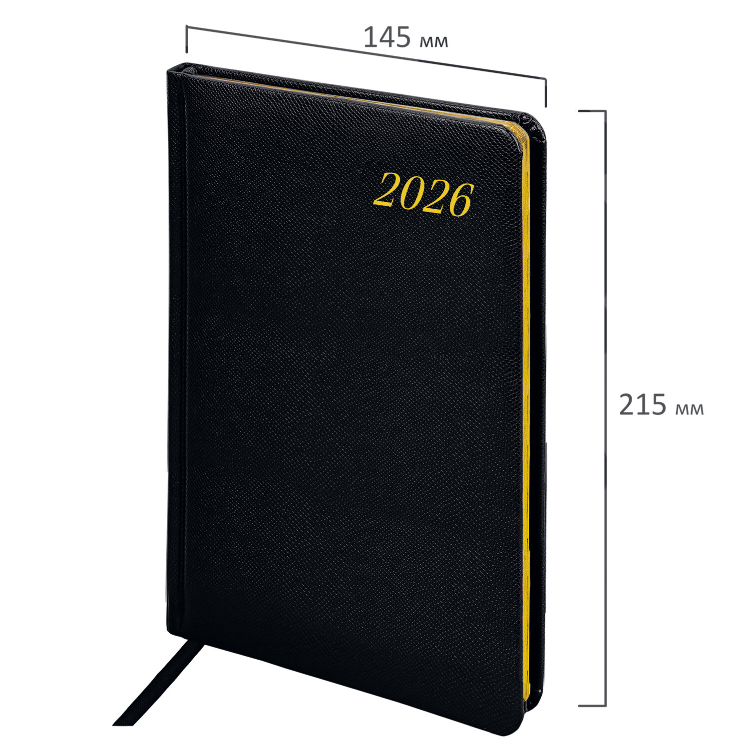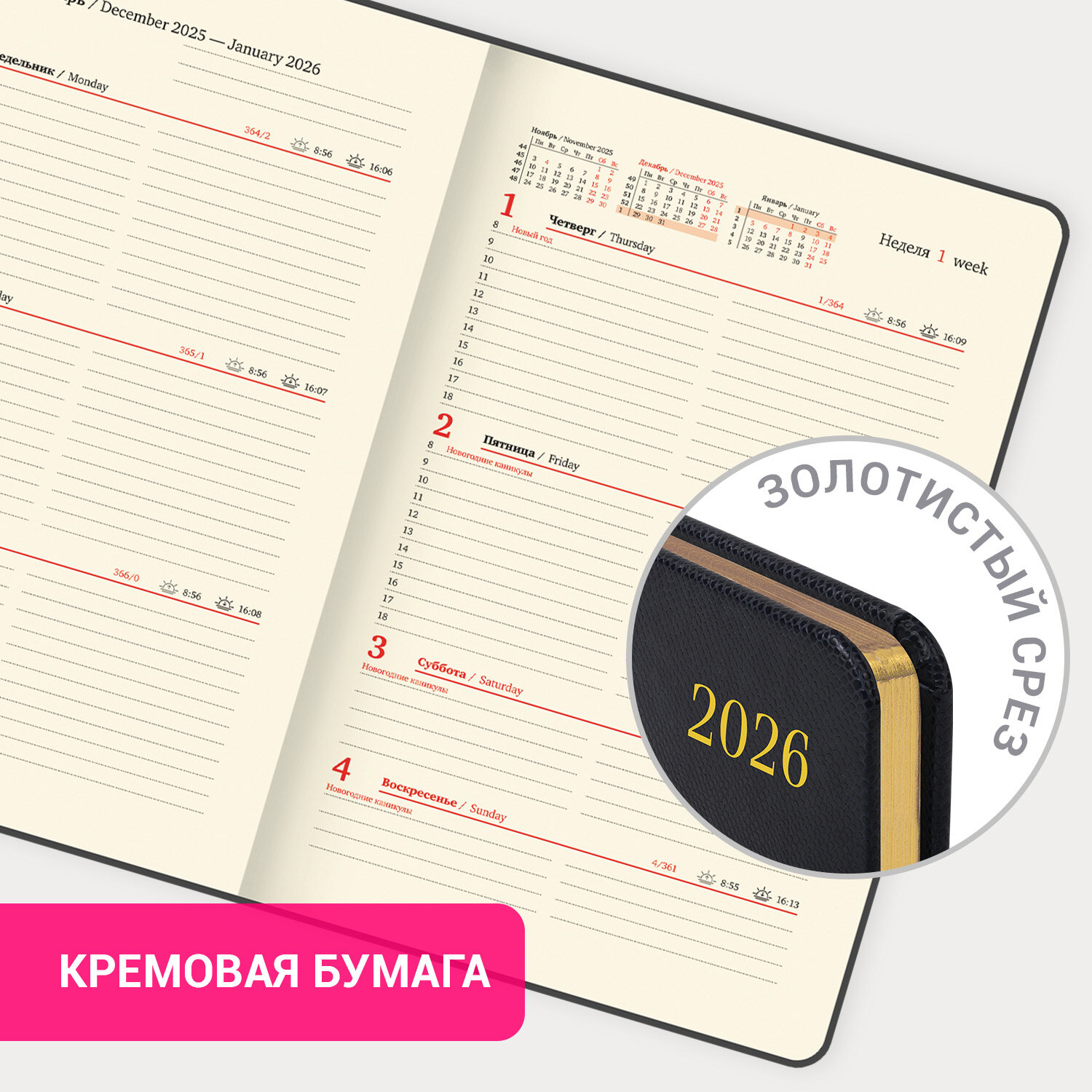 Еженедельник датированный 2026, А5, 145х215 мм, BRAUBERG «Iguana», под кожу, черный, 117171