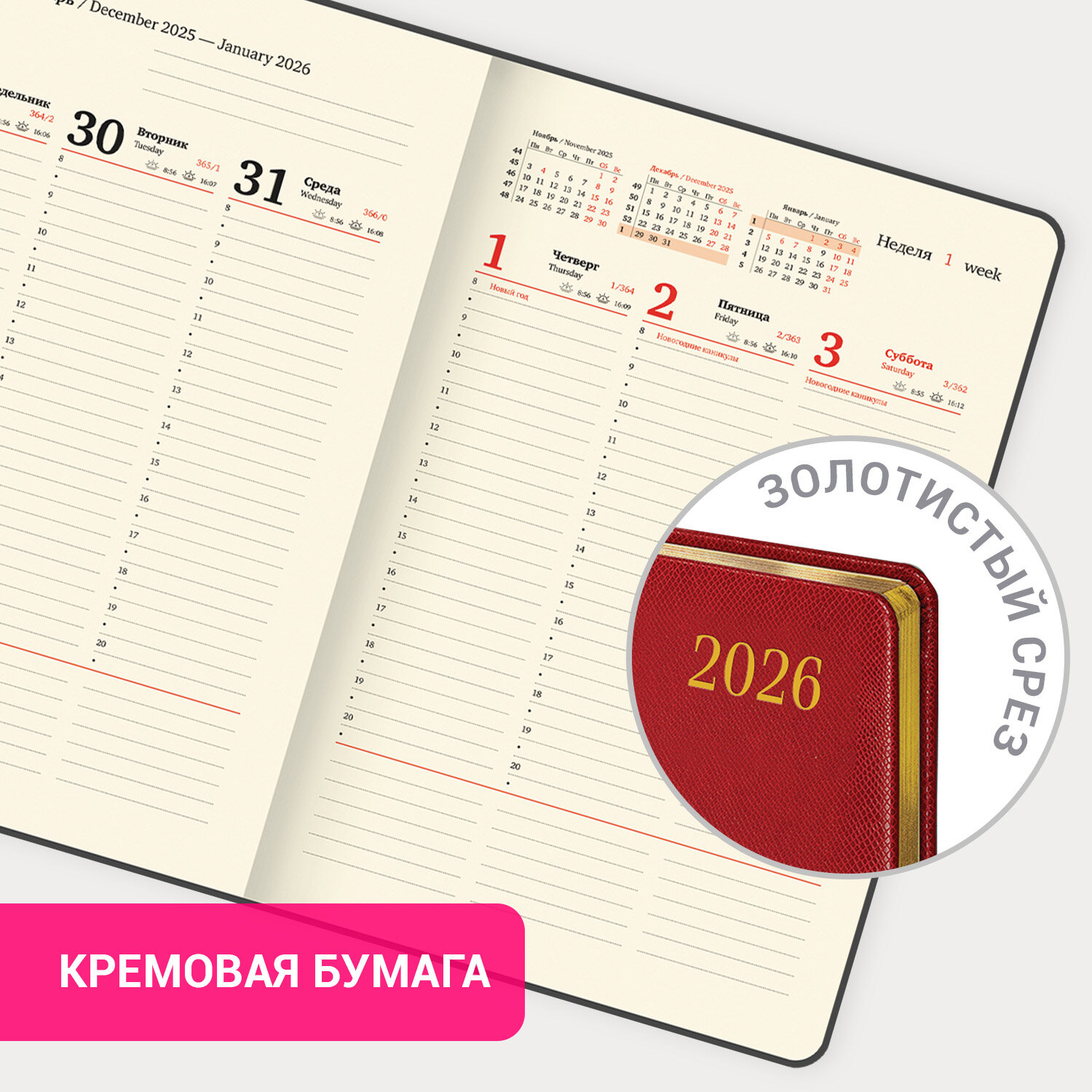 Еженедельник датированный 2026, БОЛЬШОЙ ФОРМАТ 210х297 мм, А4, BRAUBERG «Iguana», под кожу, красный, 117154