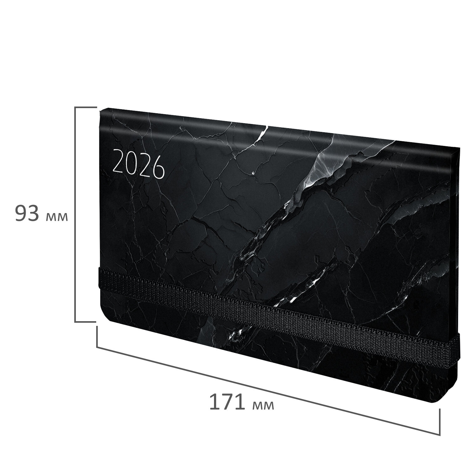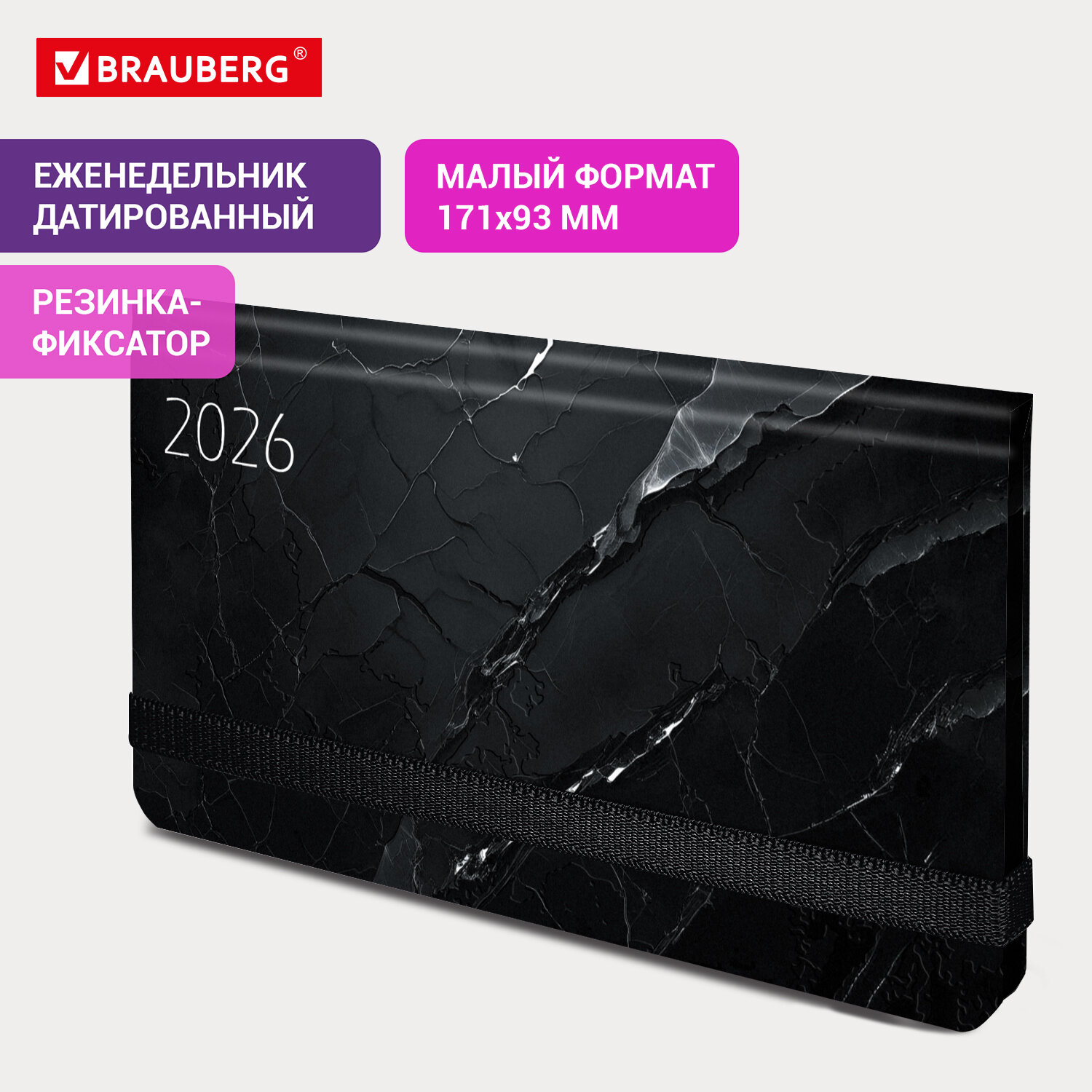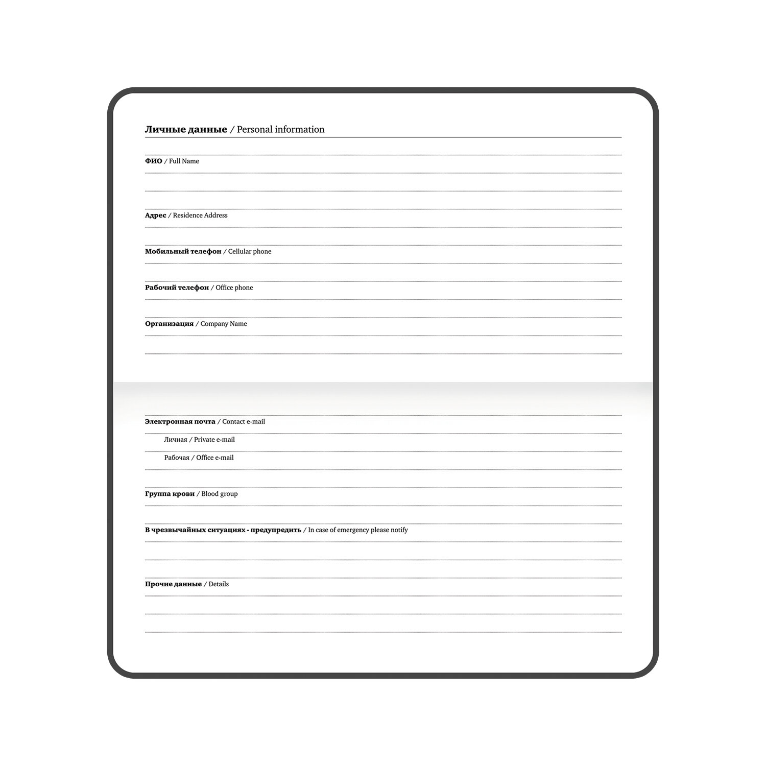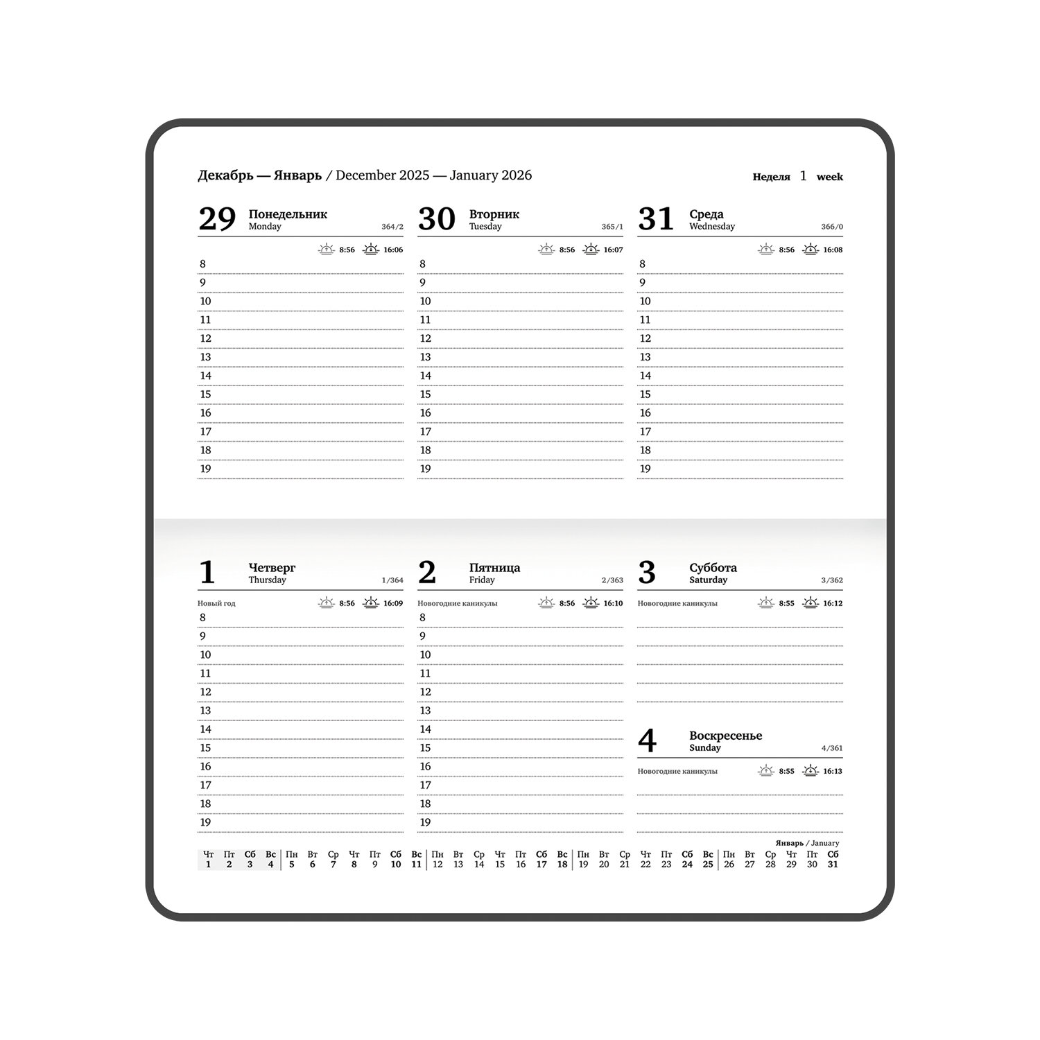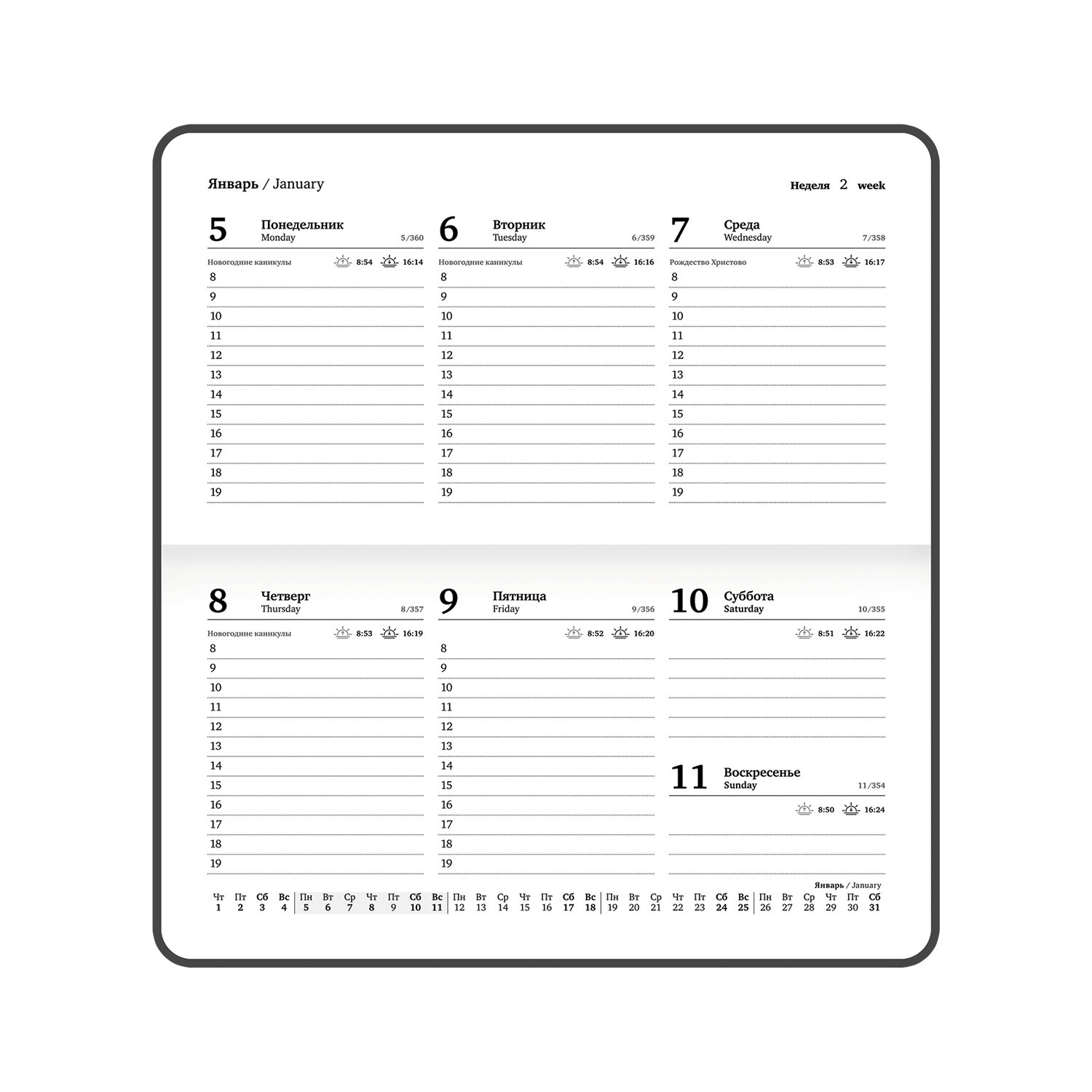 Внутренний блок содержит 64 листа офсетной бумаги белого цвета плотностью 60 г/м2. Благодаря малому формату (171х93 мм) еженедельник удобно использовать как в офисе, так и на выездных деловых встречах.Обложка 7БЦ (твердый переплет с матовой пленкой и выборочным лаком) обеспечивает долговечность при активном использовании.Резинка-фиксатор надежно защищает от случайного раскрытия в сумке или портфеле. Еженедельник снабжен справочным материалом.