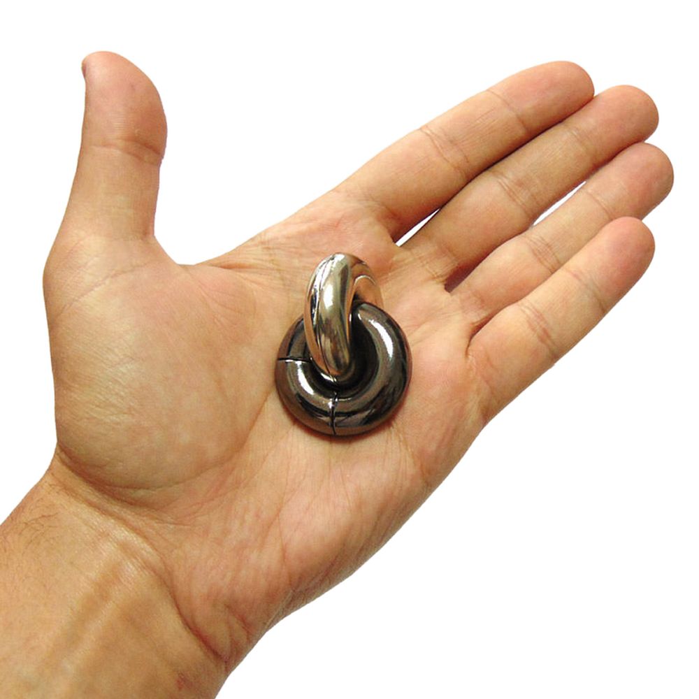 Красивая металлическая головоломка Donuts похожа на два соединенных между собой пончика. Необходимо отделить один от другого, а потом снова соединить их вместе.