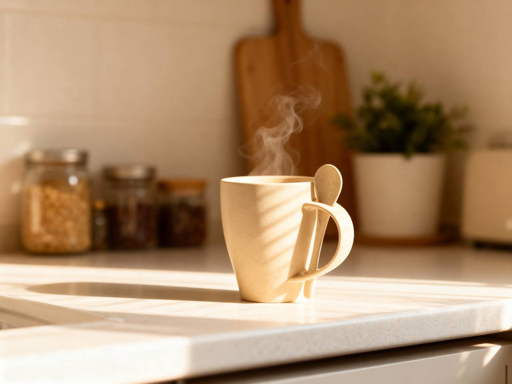 Кружка «Nina» состоит из смеси ПП-пластика (50%) и переработанной пшеницы (50%), что делает ее настоящим экомерчем. Поверхность кружки имеет приятный бежевый оттенок с небольшими вкраплениями-точками темно-серого цвета, которые только подчеркивают природное происхождение «Nina».