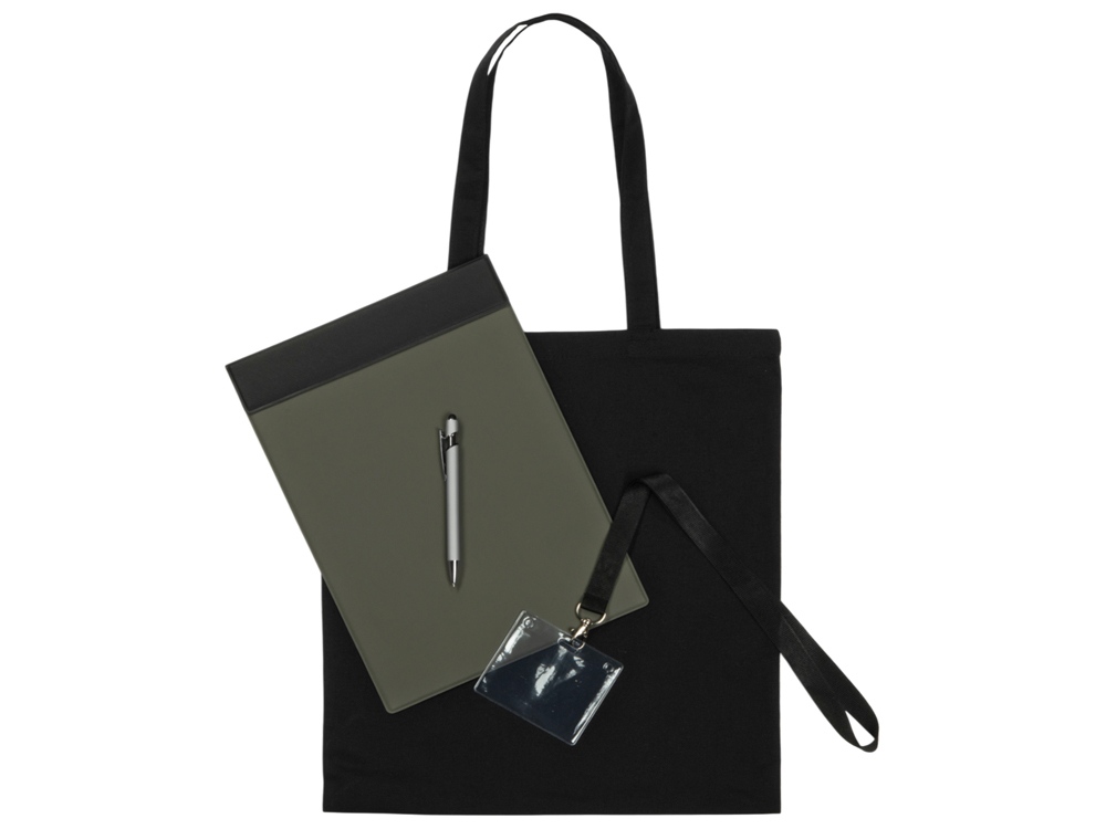 Базовый набор для конференций. В наборе: магнитный планшет для бумаг, ручка для записей, ланъярд и чехол для бейджа участника и шоппер, в который все можно удобно сложить.