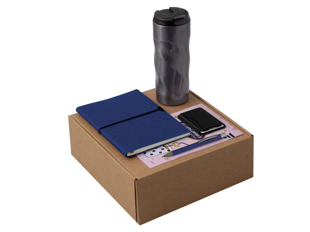 блокнот- искусственная кожа, бумага, ручка — металл с поверхностью soft-touch, термокружка — кружка- нержавеющая сталь, крышка- пластик, картхолдер — переработанный полиуретан, открытка — бумага, коробка- картон