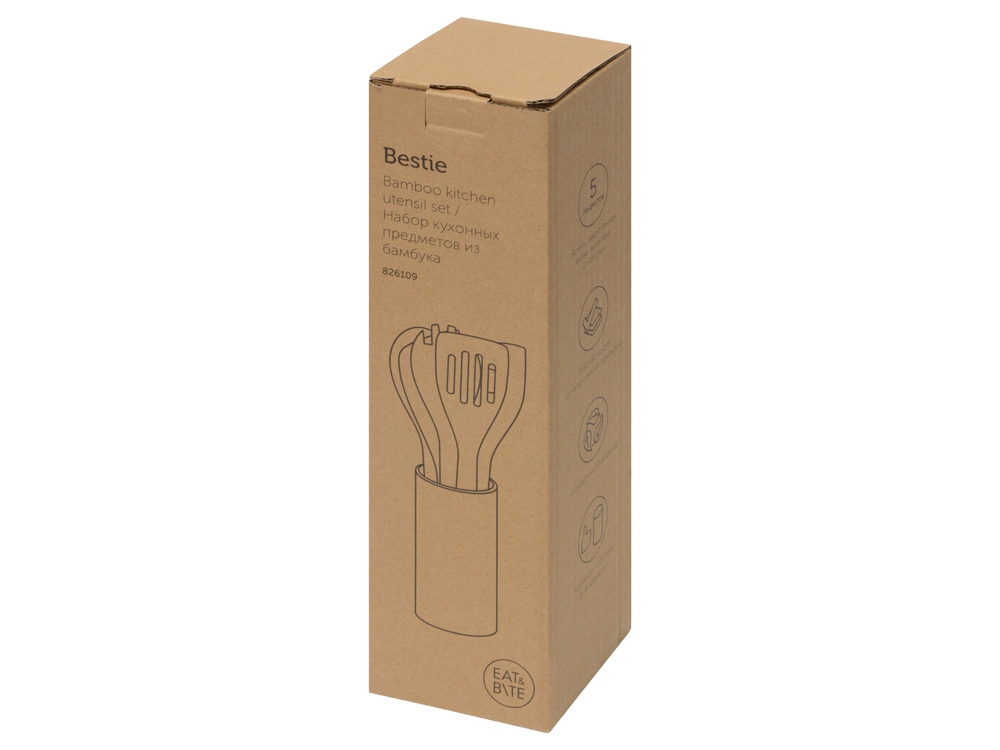 В набор входят лопатки и ложки, необходимые для приготовления различных блюд. С помощью удобной подставки из бамбука, которая идет в комплекте, принадлежности всегда будут под рукой.
