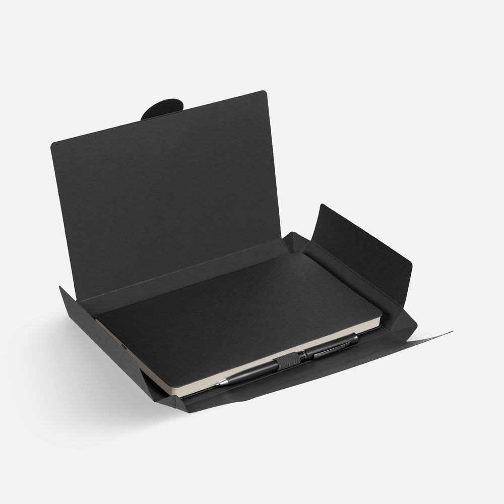 Зауженный ежедневник и ручка комплементарного оттенка в простой лаконичной коробке — готовое предложение делового подарка для сотрудников и партнеров.