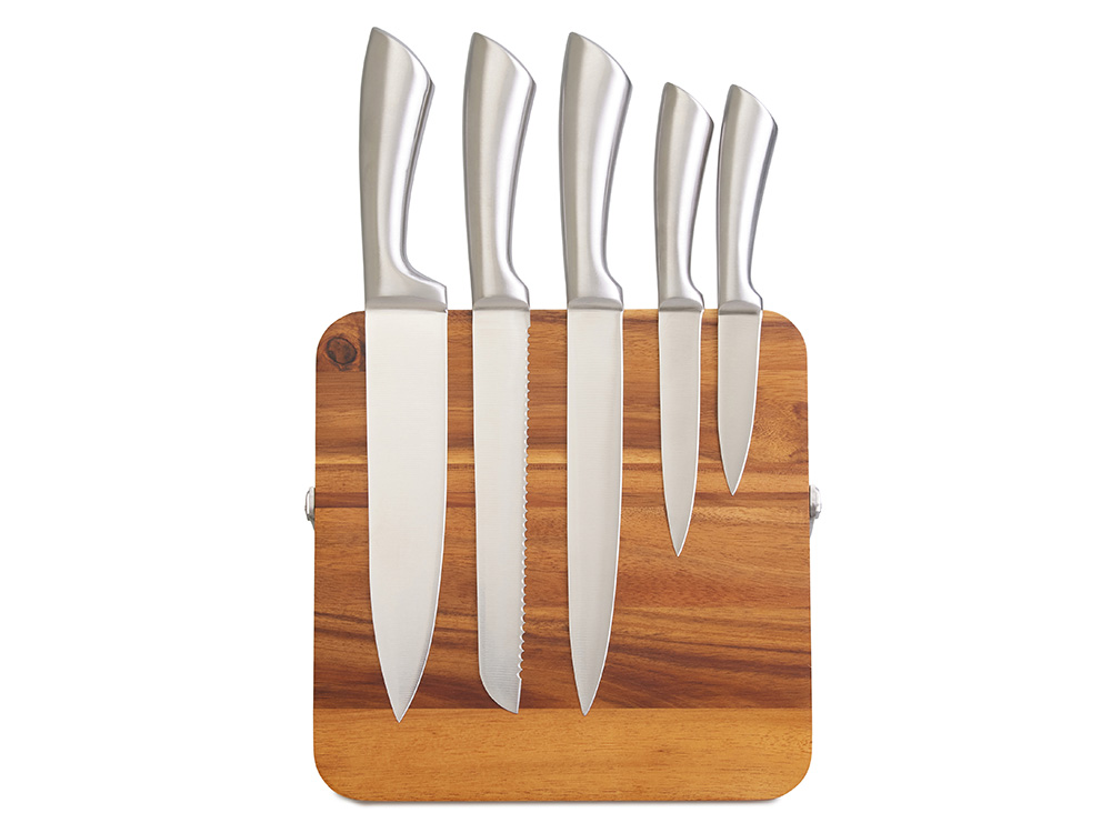 Набор ножей «Терон» на магнитной подставке из акации — это отличное решение для организации рабочего пространства на кухне. В комплекте пять ножей из нержавеющей стали и подставка, которая объединяет функциональность и природный стиль.