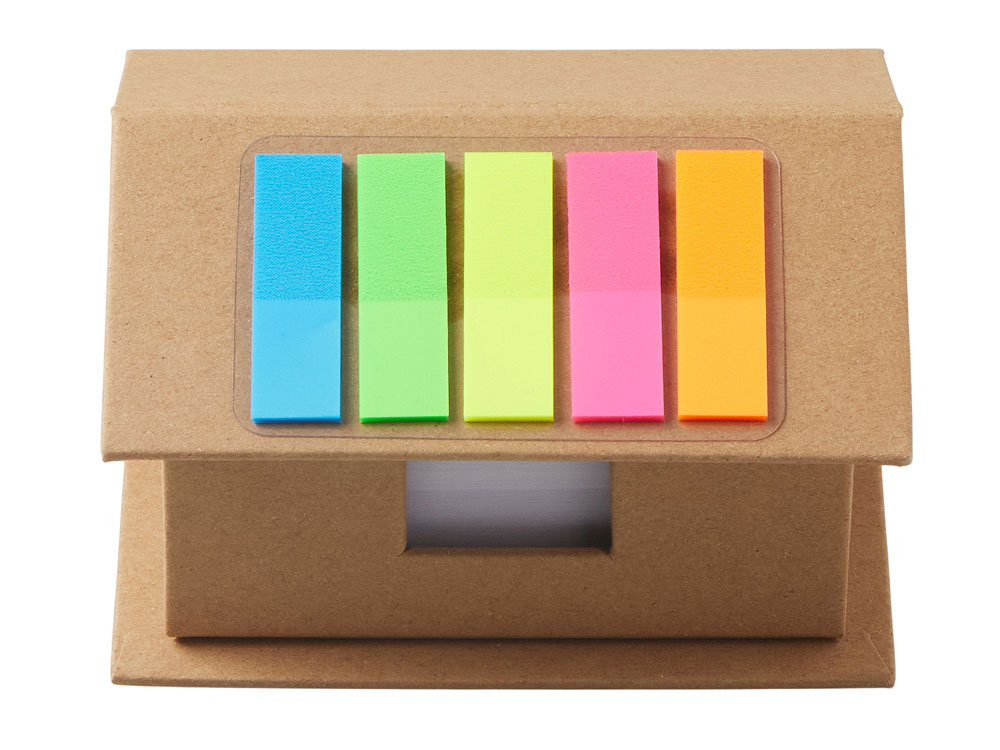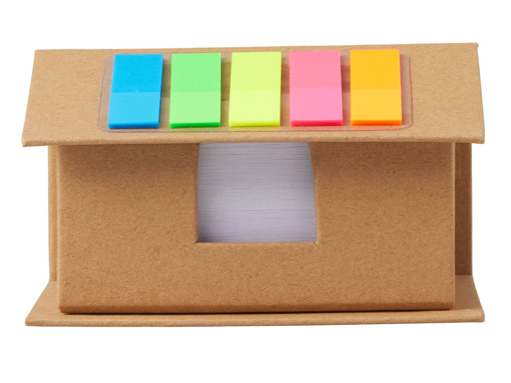 Набор стикеров и бумаг для записи в виде домика. На крыше домика расположены стикеры, 5 цветов по 25 штук каждого цвета. Внутри домика — 400 листов белой бумаги для записей плотностью 70 г/м2.