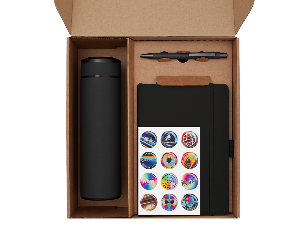 термос — нержавеющая cталь с покрытием софт-тач, блокнот — искусственная кожа с покрытием софт-тач, ручка — металл с покрытием софт-тач, чай — крафт-пакет, стикеры — смола, держатель для телефона — пластик, коробка — картон