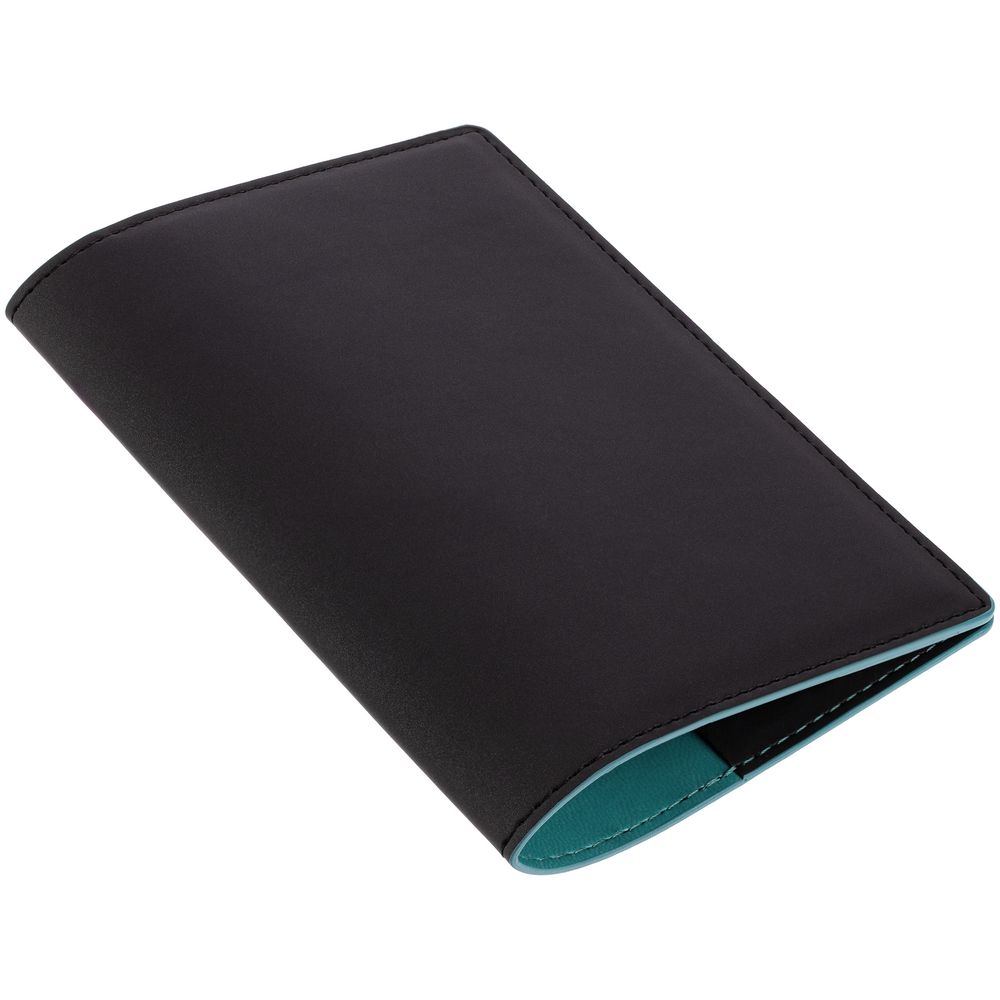 Обложка выполнена из материала Soft Touch Pearl, черный АА и срез обложки окрашен в цвет внутреннего материала Latte, бирюзовый II.