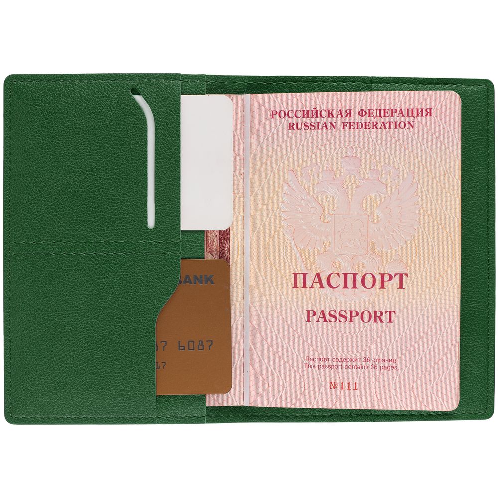 Имеет основное отделение для паспорта и 2 кармана для визиток или кредитных карт.