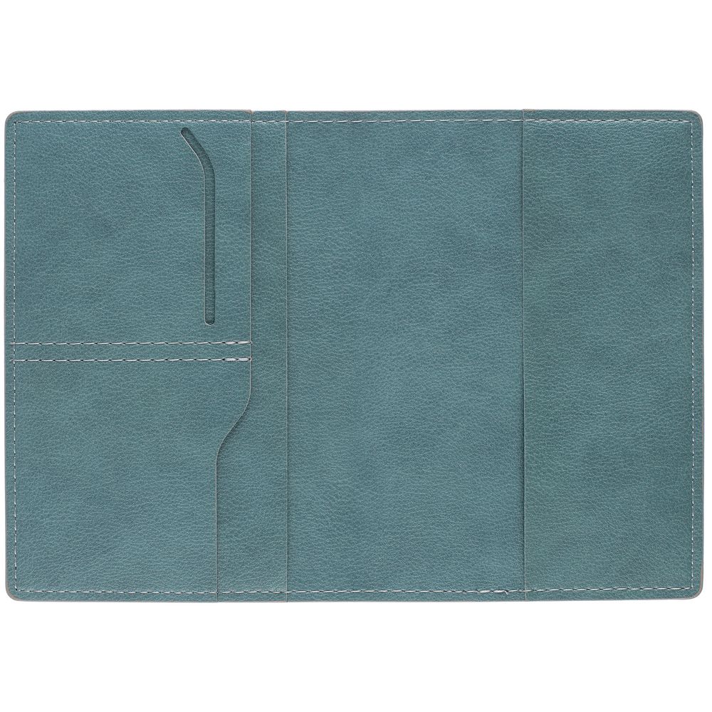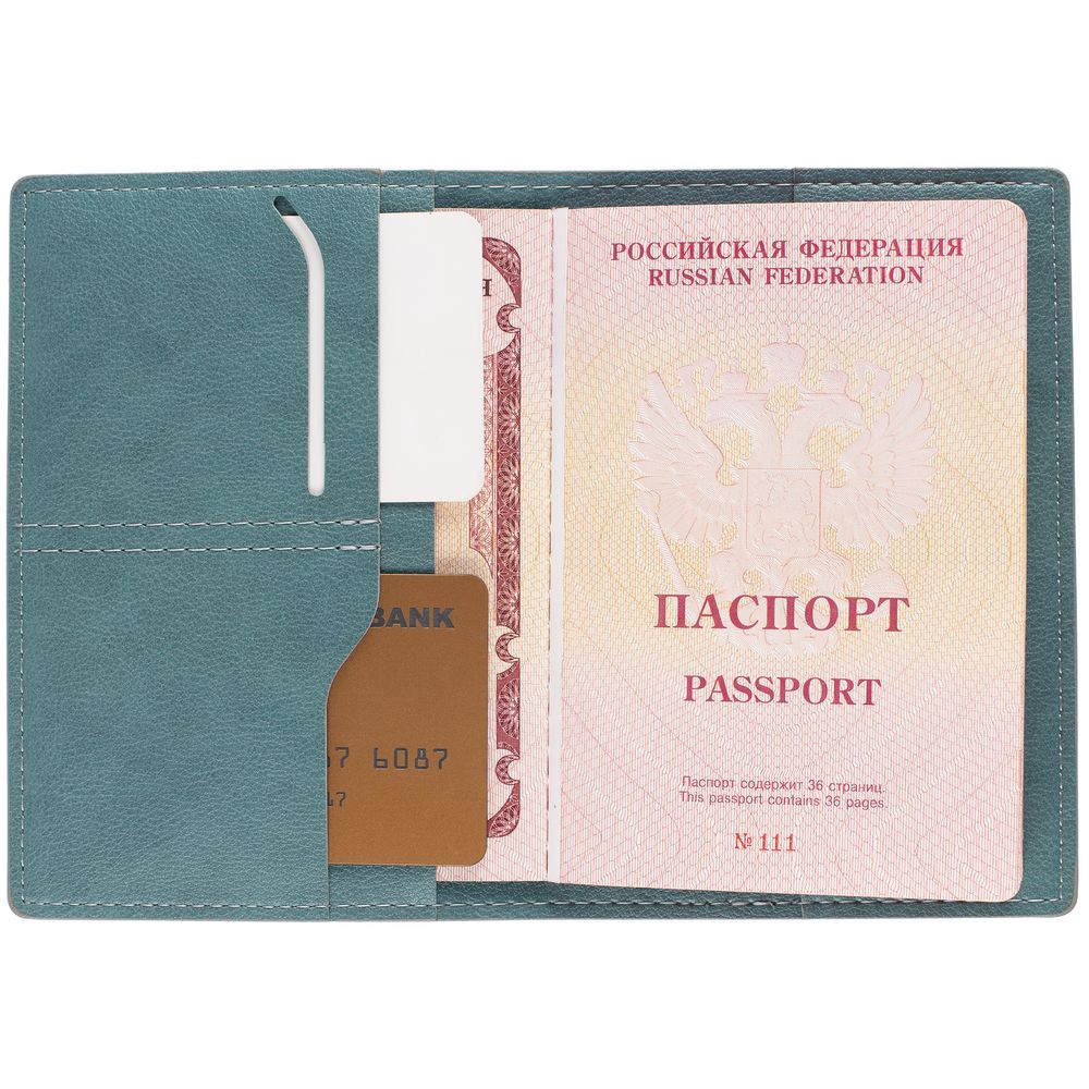 Имеет основное отделение для паспорта и 2 кармана для визиток или кредитных карт.