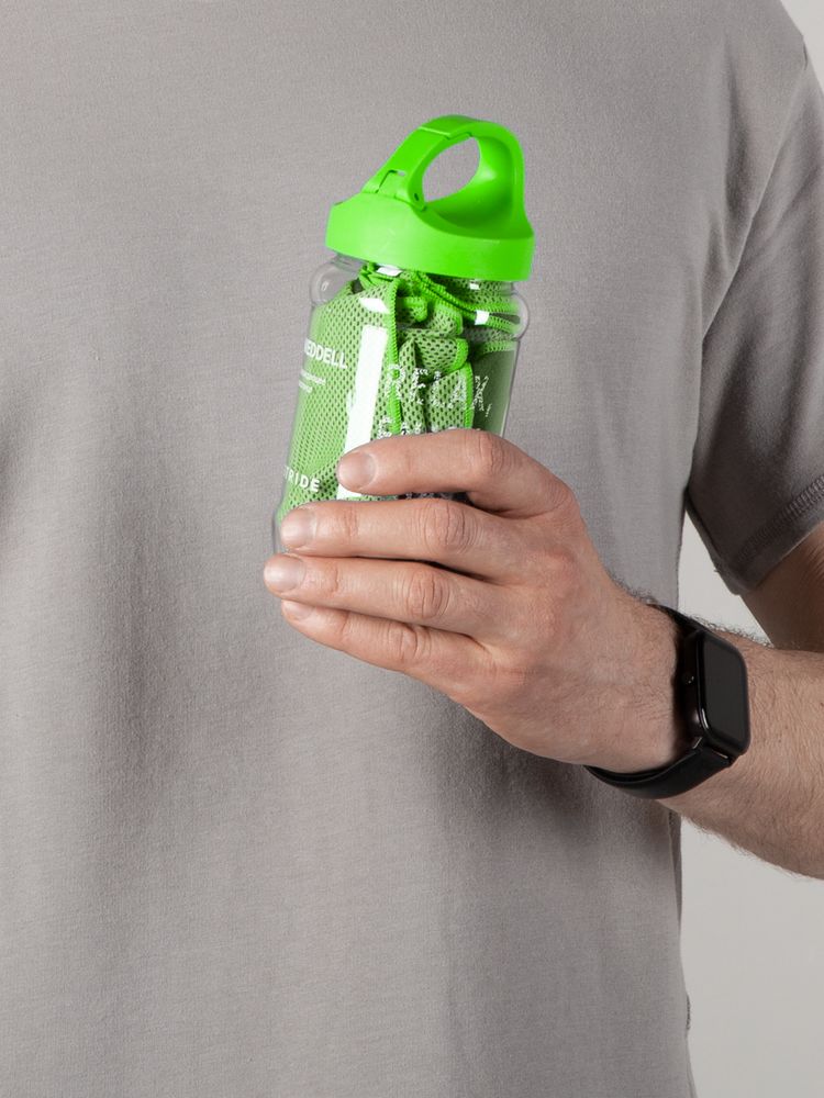 При хранении в бутылке полотенце сохранит охлаждающий эффект в течение нескольких часов. Благодаря крышке-карабину ее удобно прицепить на рюкзак или сумку.