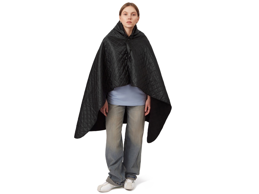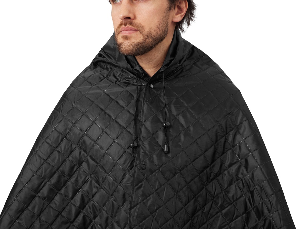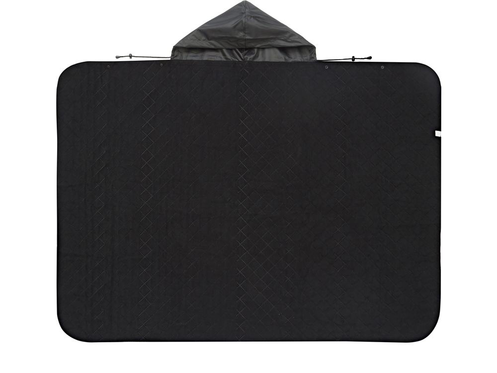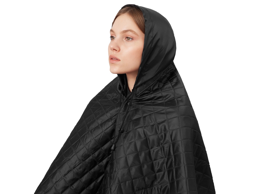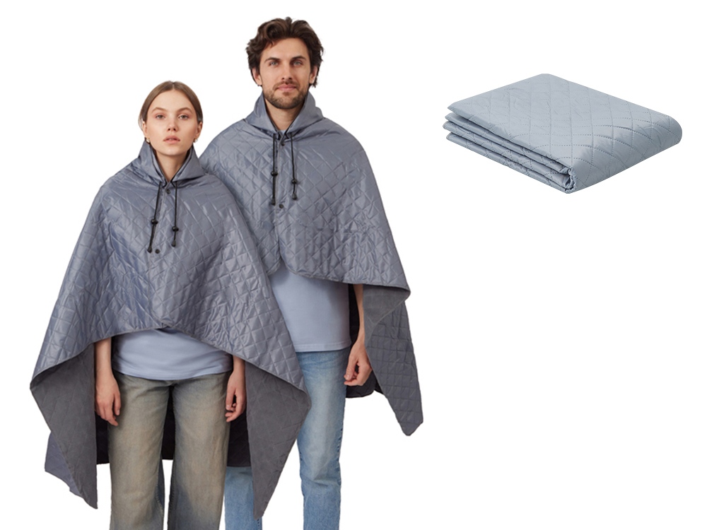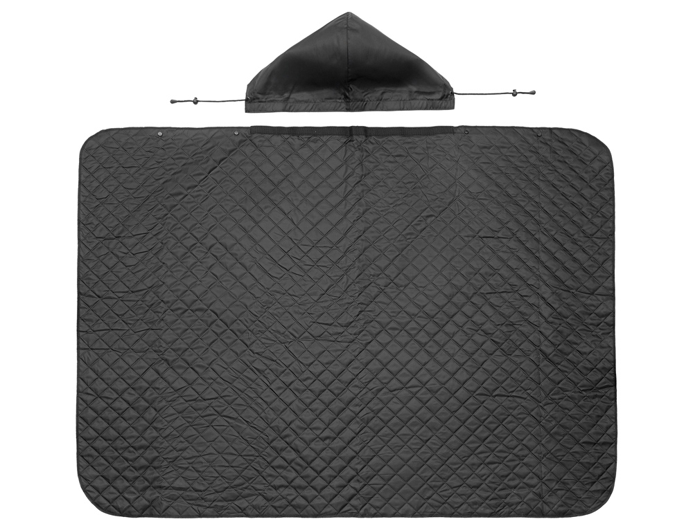 На внутренней стороне из флиса приятно и тепло сидеть, а наружная сторона из полиэстера с водоотталкивающим покрытием не позволяет пледу намокнуть или сильно испачкаться. Для больше удобства использования пледа во время дождя в комплекте идет капюшон, который фиксируется с помощью » липучки». Накинув плед на плечи, застегните его на кнопки вверху и наденьте капюшон. Вы не промокните во время неожиданного дождя!