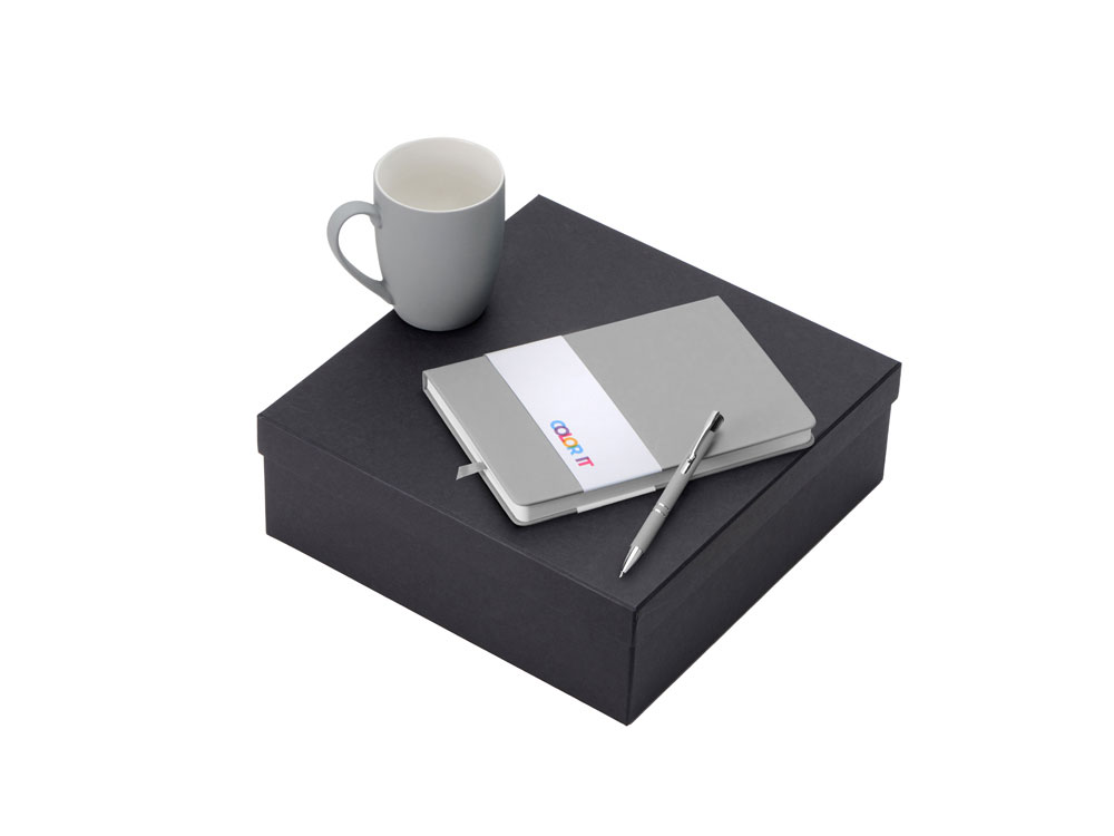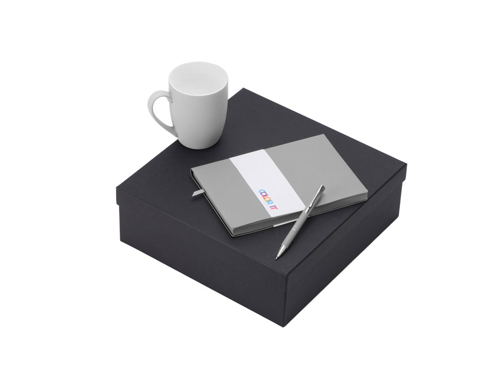 блокнот — искусственная кожа с покрытием soft-touch, ручка — алюминий с покрытием soft-touch, кружка — фарфор с покрытием soft-touch, коробка — картон