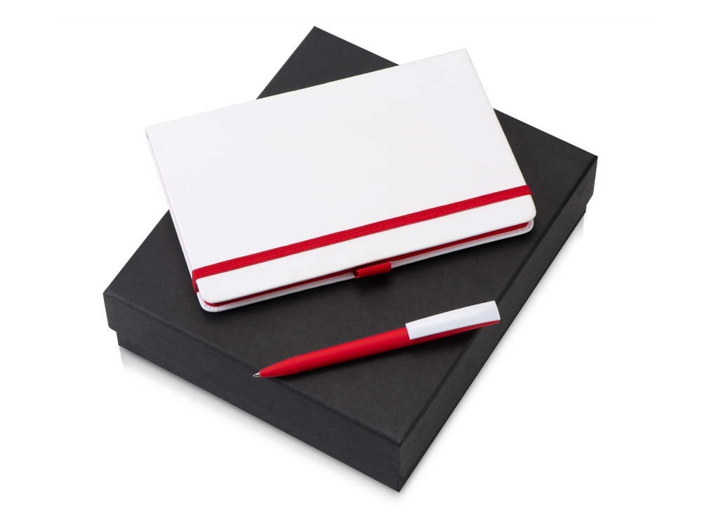 блокнот — искусственная кожа, бумага, ручка — пластик с покрытием soft-touch, коробка — кашированный картон