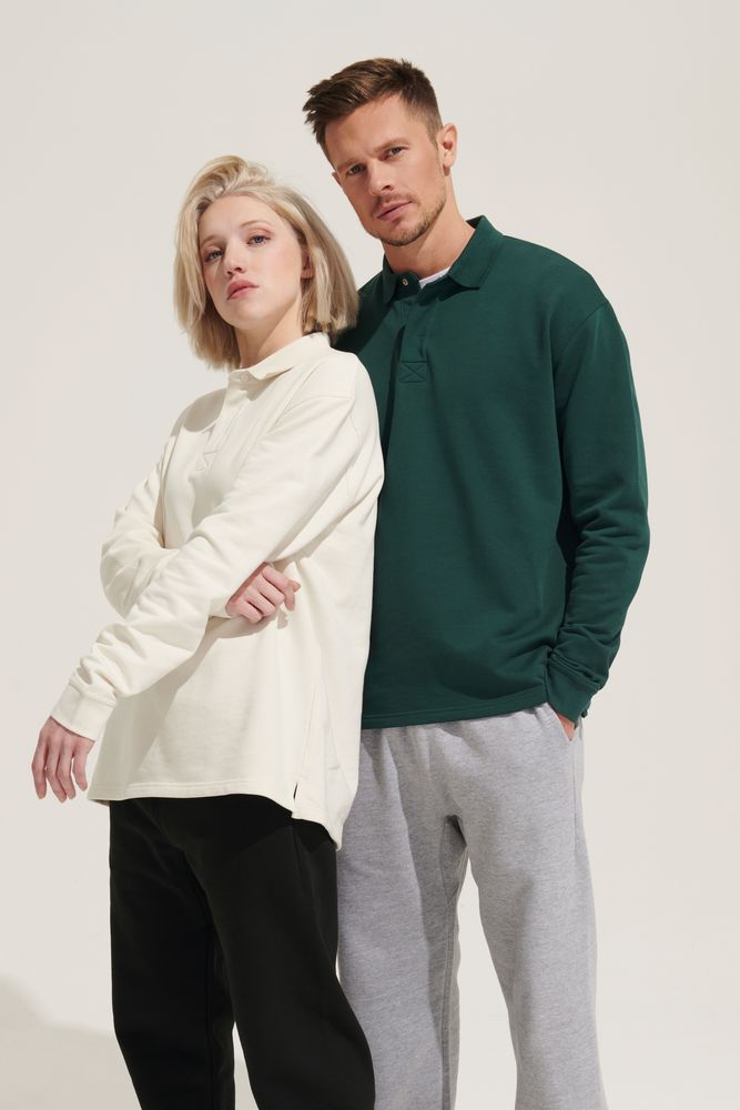 Рубашка поло из футера с длинным рукавом и спущенным плечом.