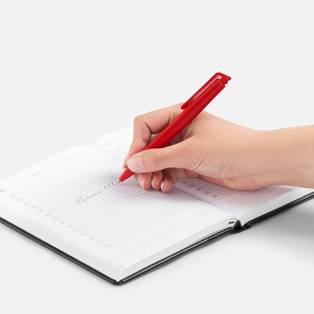 Шариковая ручка с эргономичным треугольным корпусом из матового пластика.