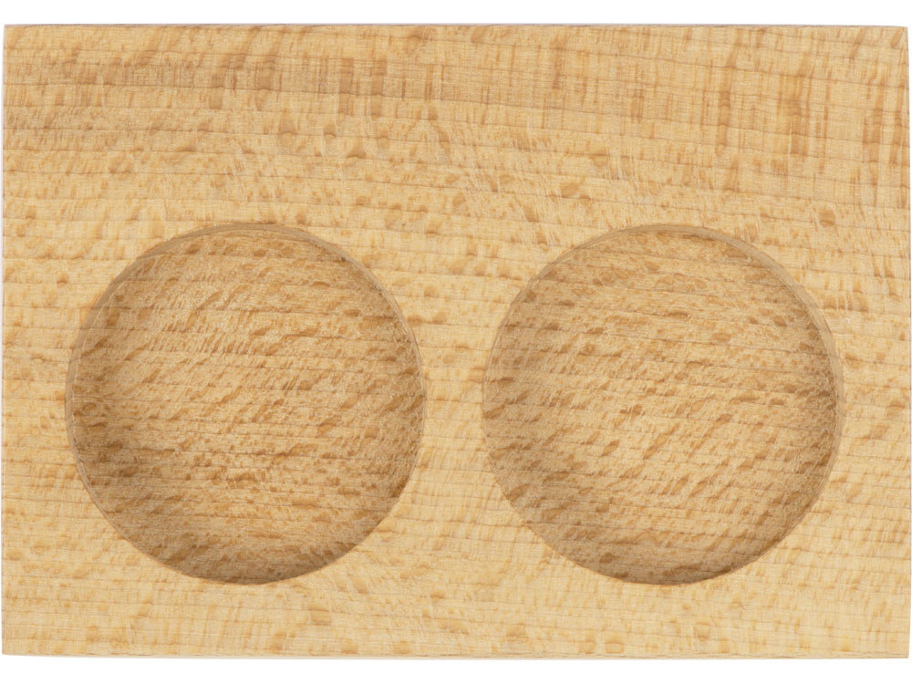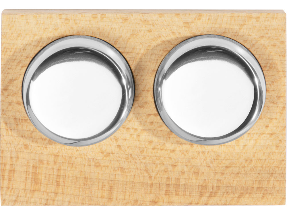 Набор состоит из двух шайб, выполненных из нержавеющей стали, и подставки из дерева, которая позволяет хранить их надлежащим образом.