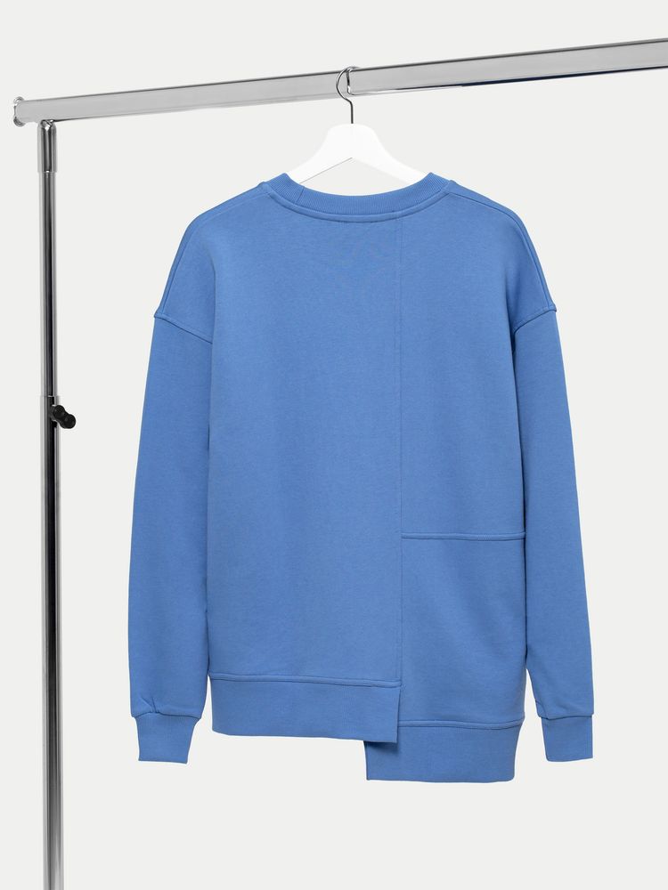 Свитшот унисекс свободного кроя со спущенным плечом и нестандартным нижним краем.