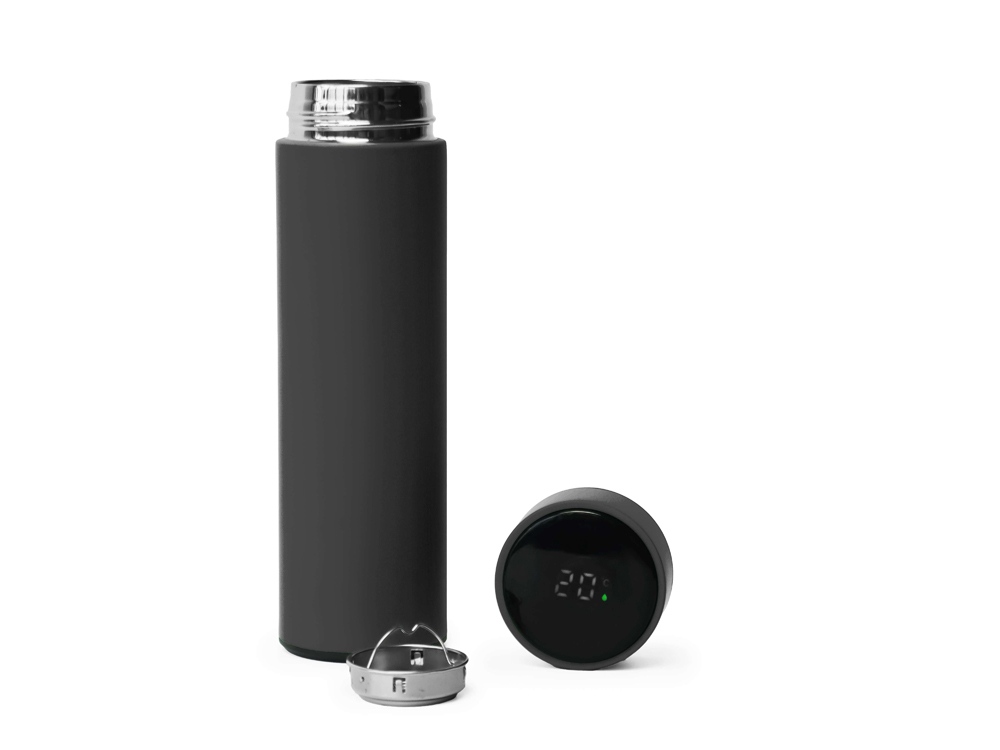 Термос из нержавеющей стали, покрытый цветным soft touch, с крышкой, в которой встроен термометр и LED дисплей, показывающий температуру внутри термоса. Объем: 500 мл. Упаковка: каждый термос в крафт коробке.