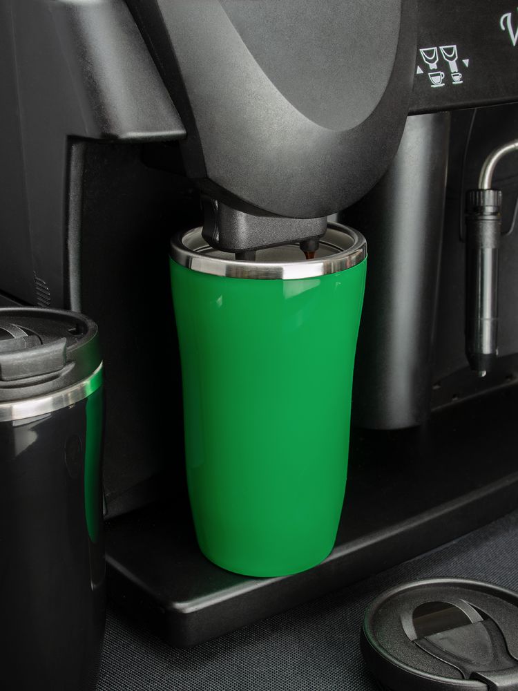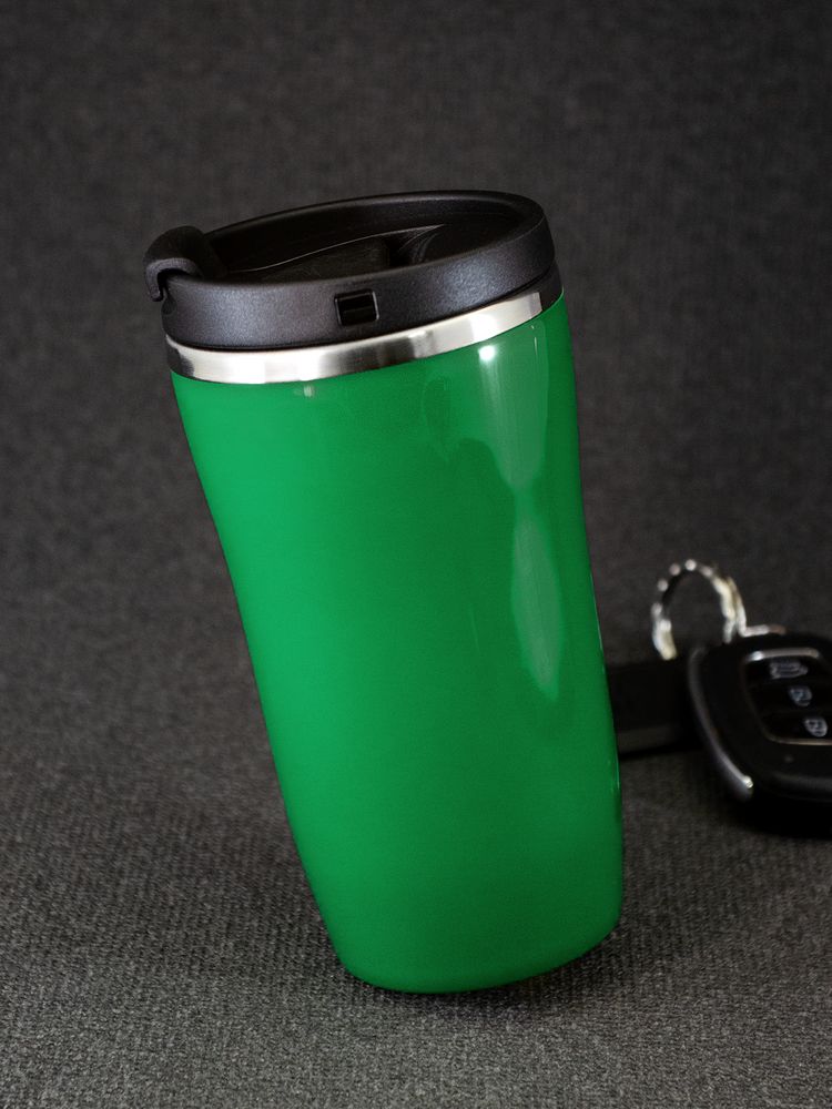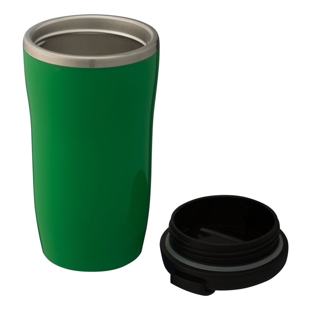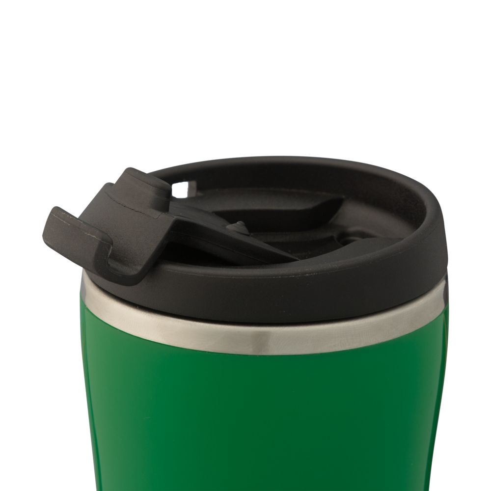Двухслойная конструкция из пластика снаружи и пищевой нержавеющей стали внутри. Герметичная завинчивающаяся крышка с откидным клапаном для питья. В отверстие в крышке можно вставить шнурок для удобного ношения стакана на руке. Шнурок в комплект не входит.