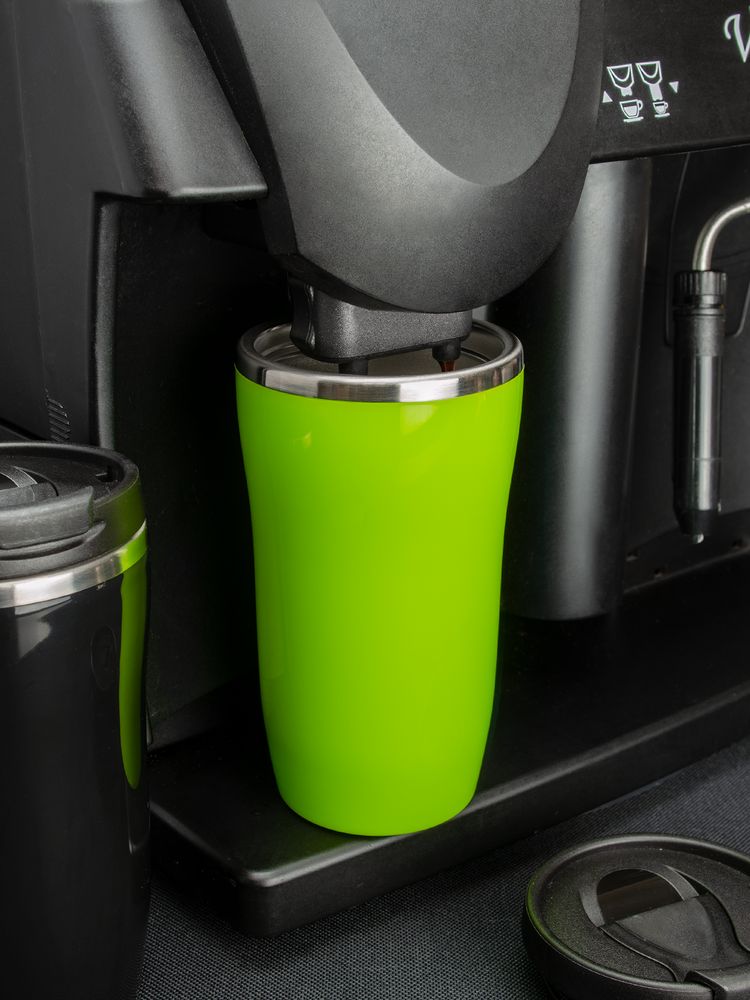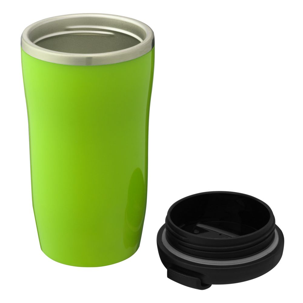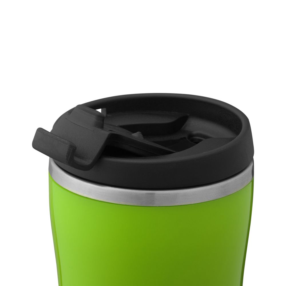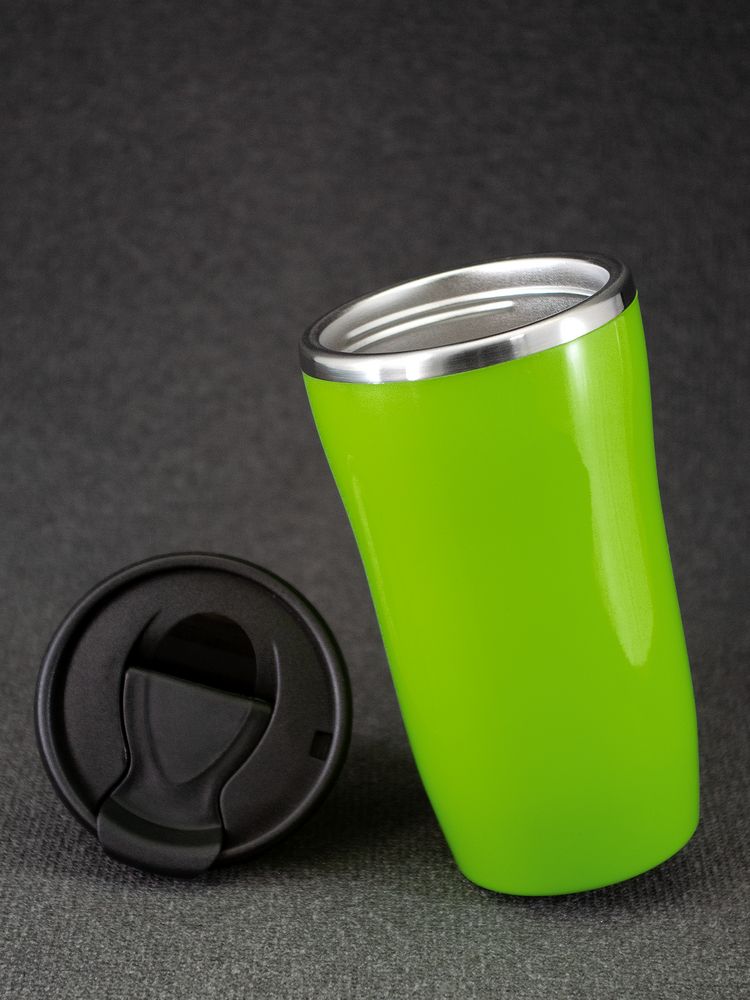 Двухслойная конструкция из пластика снаружи и пищевой нержавеющей стали внутри. Герметичная завинчивающаяся крышка с откидным клапаном для питья. В отверстие в крышке можно вставить шнурок для удобного ношения стакана на руке. Шнурок в комплект не входит.