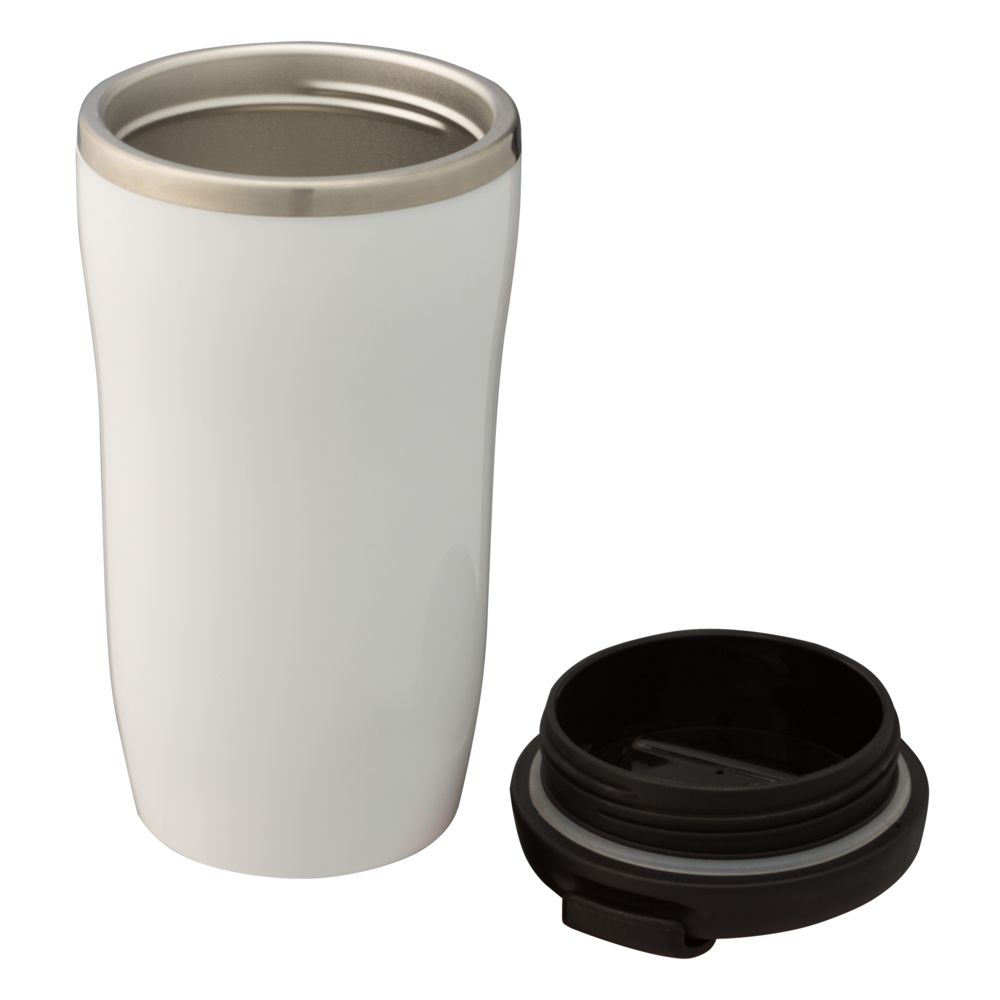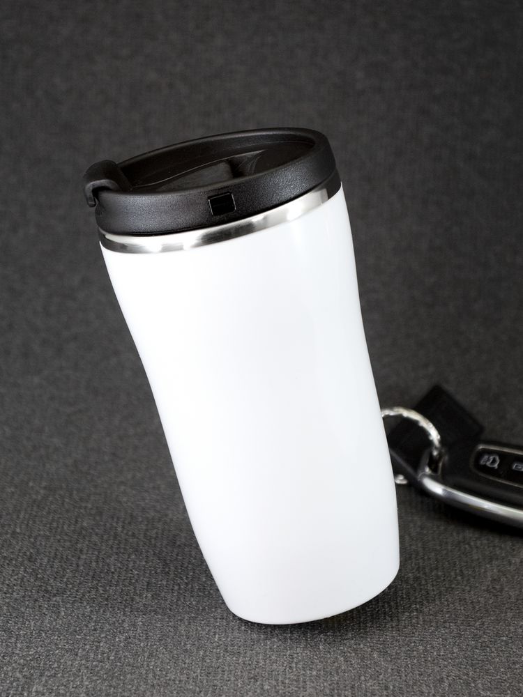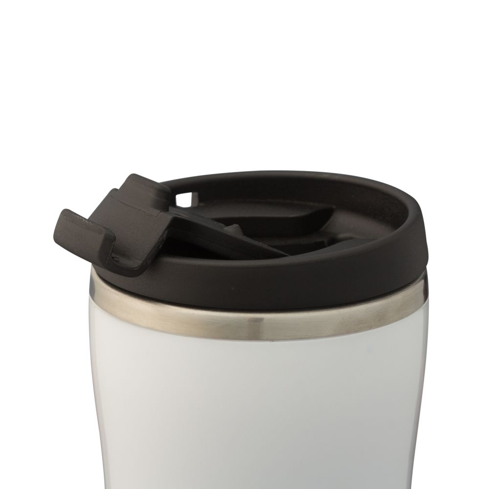 Двухслойная конструкция из пластика снаружи и пищевой нержавеющей стали внутри. Герметичная завинчивающаяся крышка с откидным клапаном для питья. В отверстие в крышке можно вставить шнурок для удобного ношения стакана на руке. Шнурок в комплект не входит.